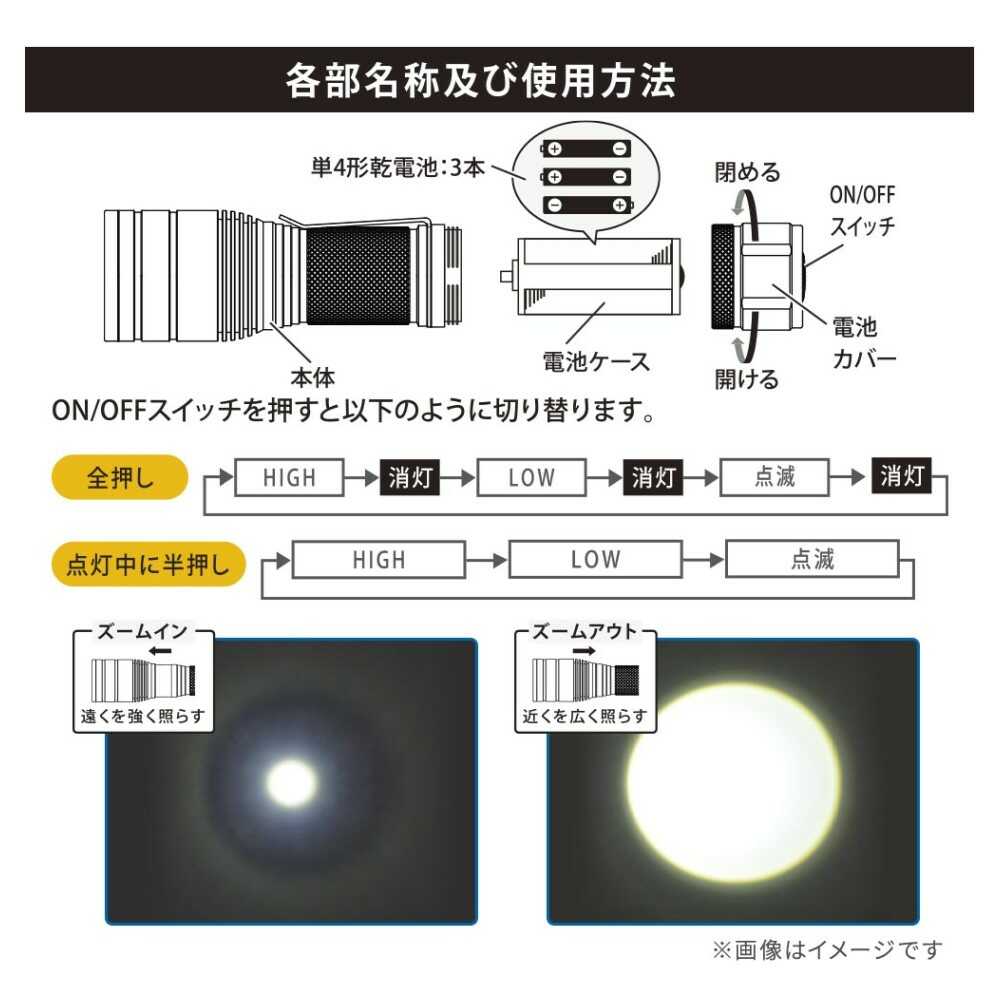 ● 480 lm ● 保護等級:IPX4 防まつ形 ● Zoom 集光/散光 ● 連続点灯(約):3.5~12時間 ● 3モード:High/Low 点滅