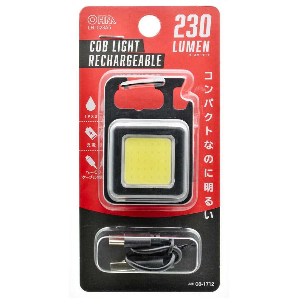 コンパクトなのに明るい、3段調光、ブースターモード、強、弱、点滅機能付き、COB、LED、広範囲を照らす、IPX3、防雨形、USB充電式、Type-Cケーブル付、カラビナ付き