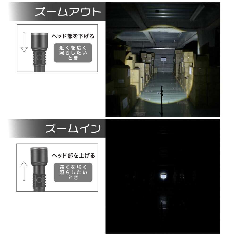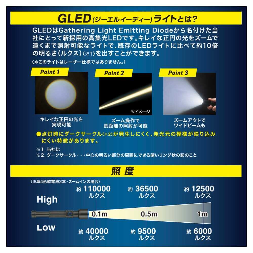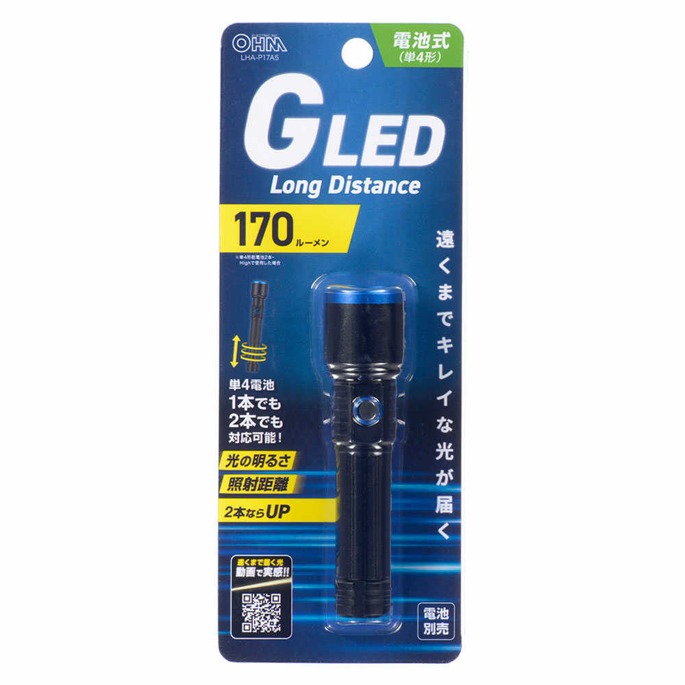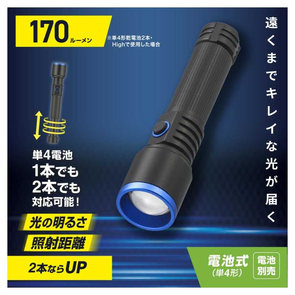 遠くまでキレイな光が届く、LEDライト、約10倍の明るさ、ルクス、ダークサークルが発生しにくい、キレイな正円の光、ズーム操作、長距離の照射が可能、最大照射距離、約225m、ズームアウト、ワイドビーム、明るさ調節機能付き、High、Low、点滅、全光束170ルーメン、単4形乾電池2本使用、単4電池、1本、2本、使用可能