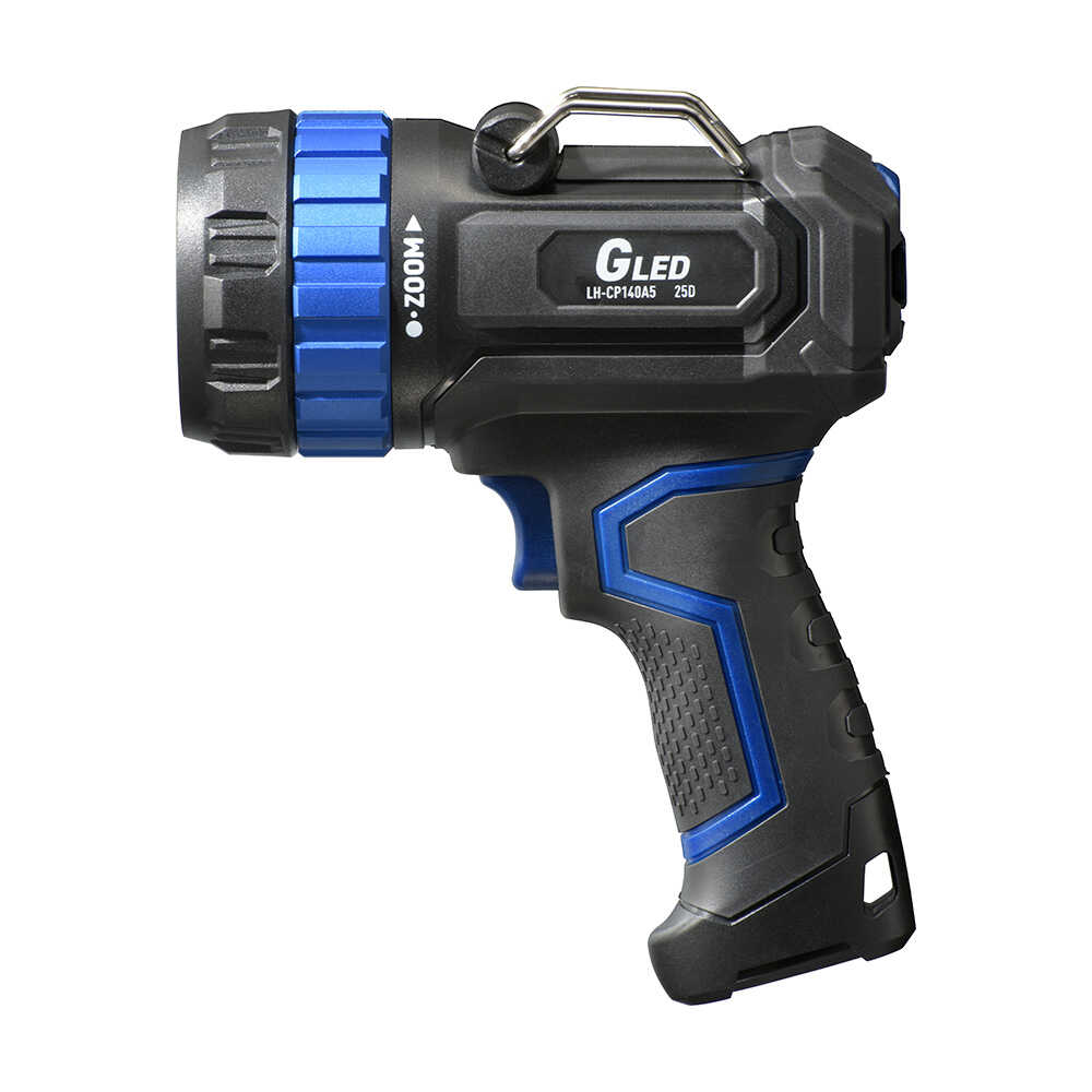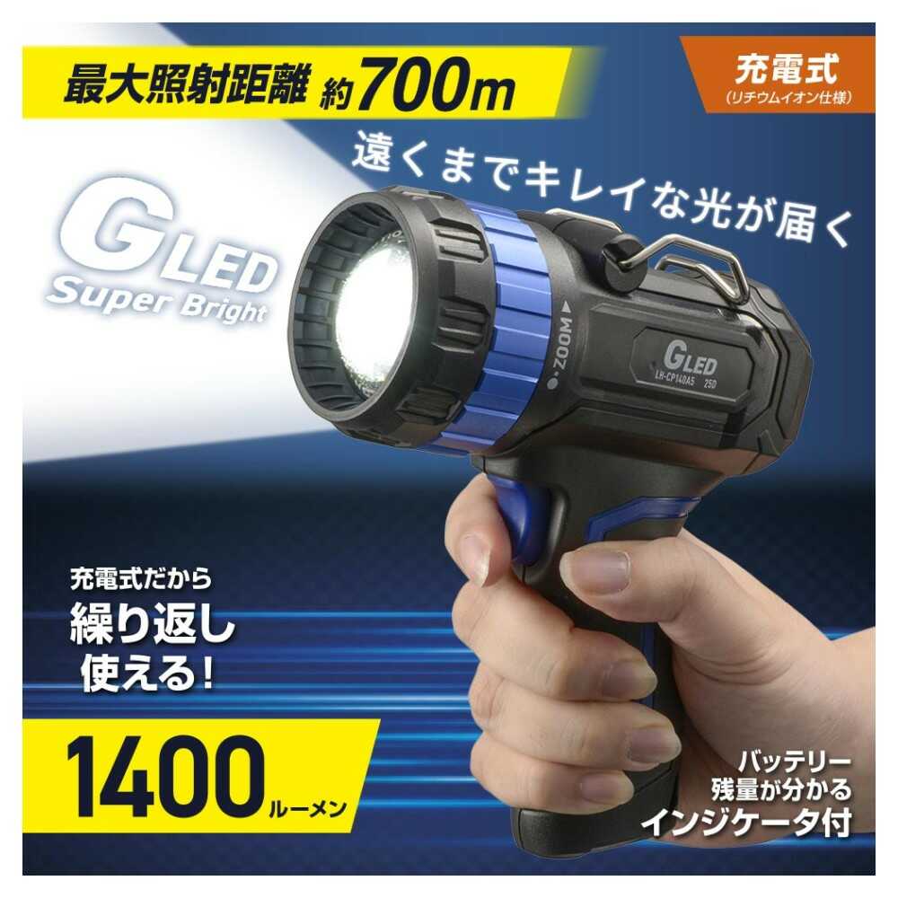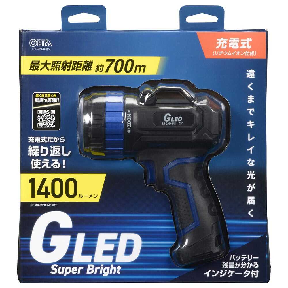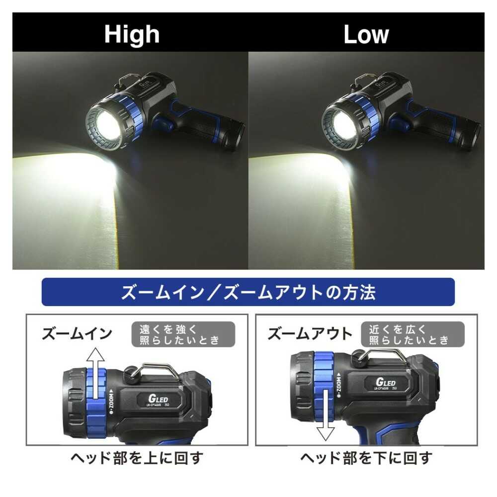 LEDライト、正円の光、長距離の照射、ズームアウト、ワイドビーム、全光束1400ルーメン、明るさ調節機能、充電式、バッテリー残量、インジケータ付き