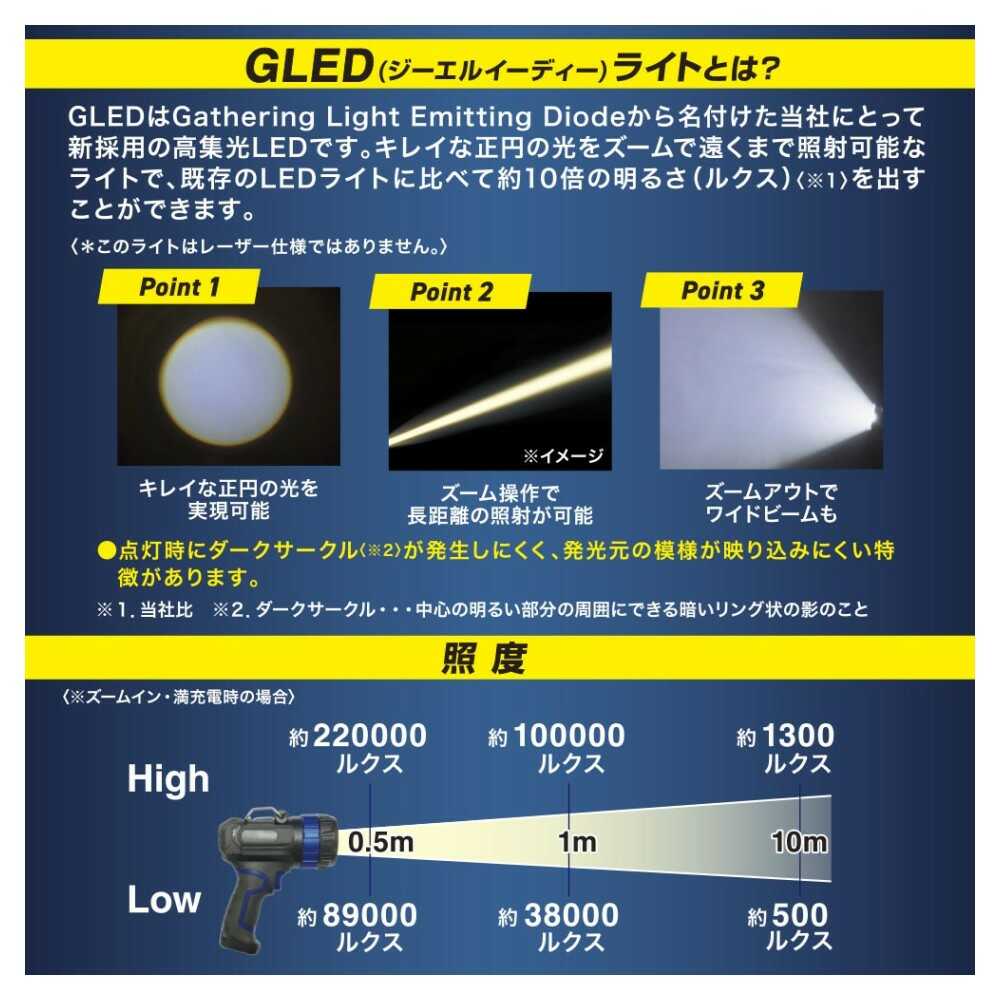 ● 遠くまでキレイな光が届くLEDライト ● 既存のLEDライトに比べて約10倍の明るさ(ルクス) ● ダークサークルが発生しにくいキレイな正円の光 ● ズーム操作で長距離の照射が可能(最大照射距離 約700m) ● ズームアウトでワイドビームも ● 全光束1400ルーメン ※Highで使用した場合 ● 明るさ調節機能付き(High/Low/点滅) ● 充電式だから繰り返し使える ● バッテリー残量が分かるインジケータ付き