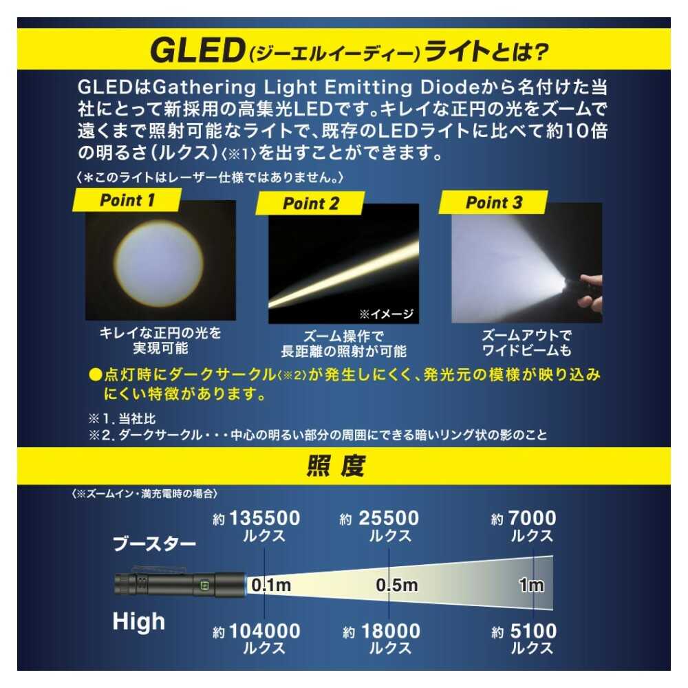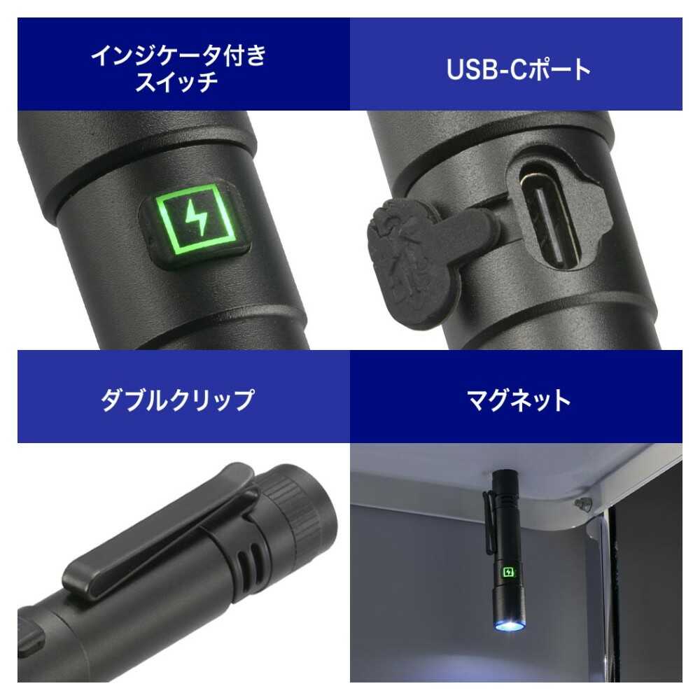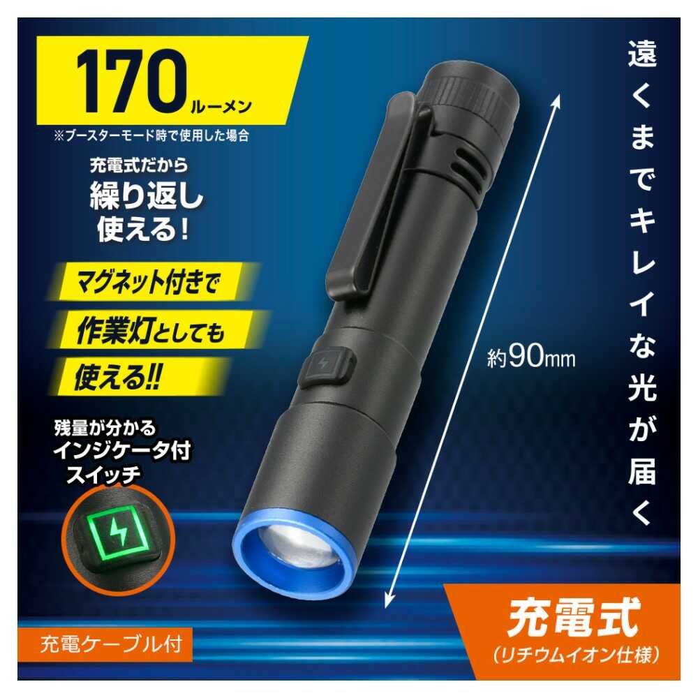 ● 遠くまでキレイな光が届く ● ダークサークルが発生しにくいキレイな正円の光 ● ズーム操作で長距離の照射が可能 ● ズームアウトでワイドビームも ● 充電式だから繰り返し使える ● マグネット付きで作業灯としても使える ● 充電時期が分かるインジケータ付スイッチ