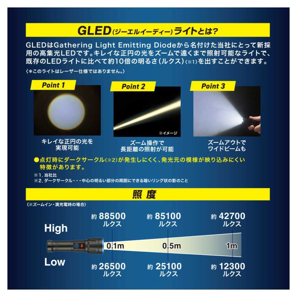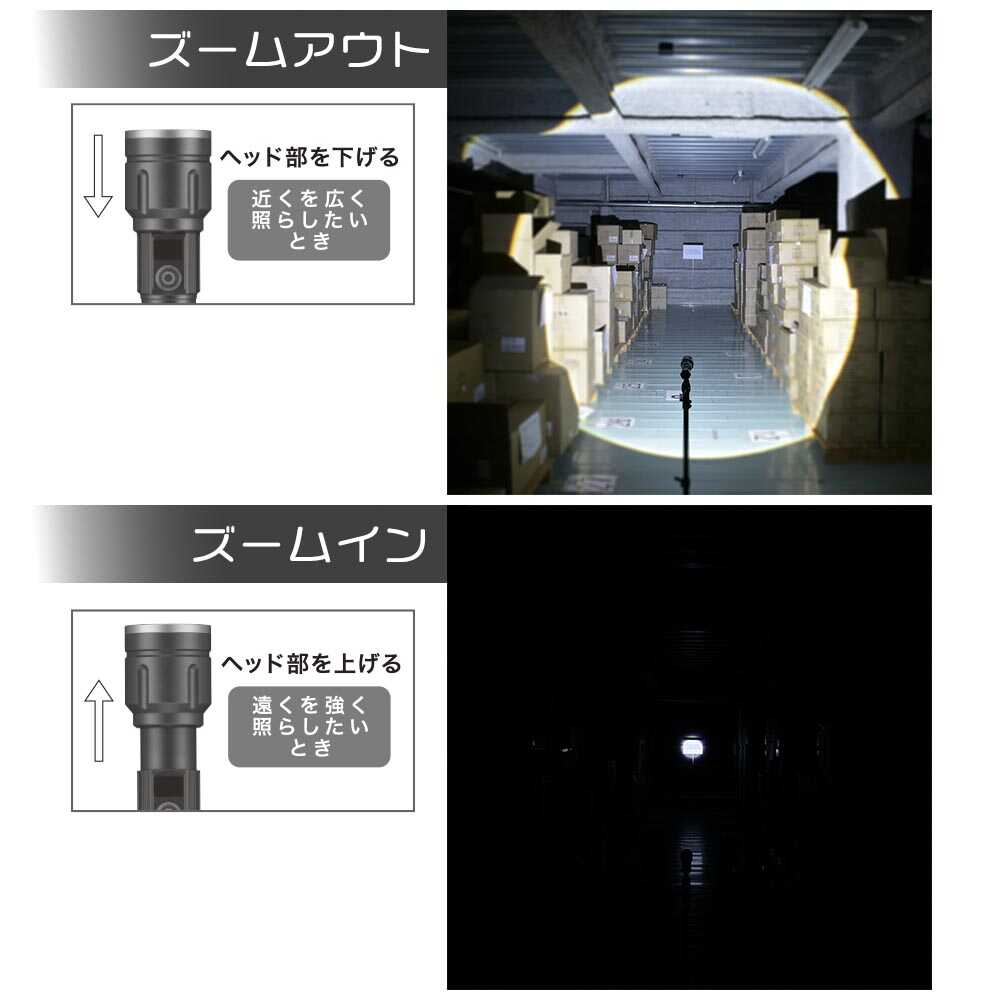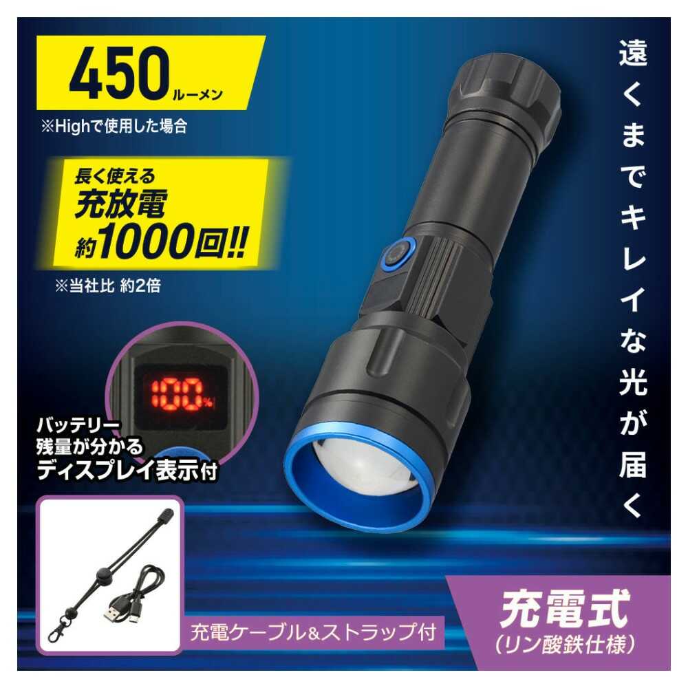 長く使える、ダークサークル、キレイな正円の光、ズーム操作、長距離照射が可能、ズームアウト、ワイドビーム、全光束450ルーメン、明るさ調節機能、リン酸鉄仕様、バッテリー残量、ディスプレイ表示付き