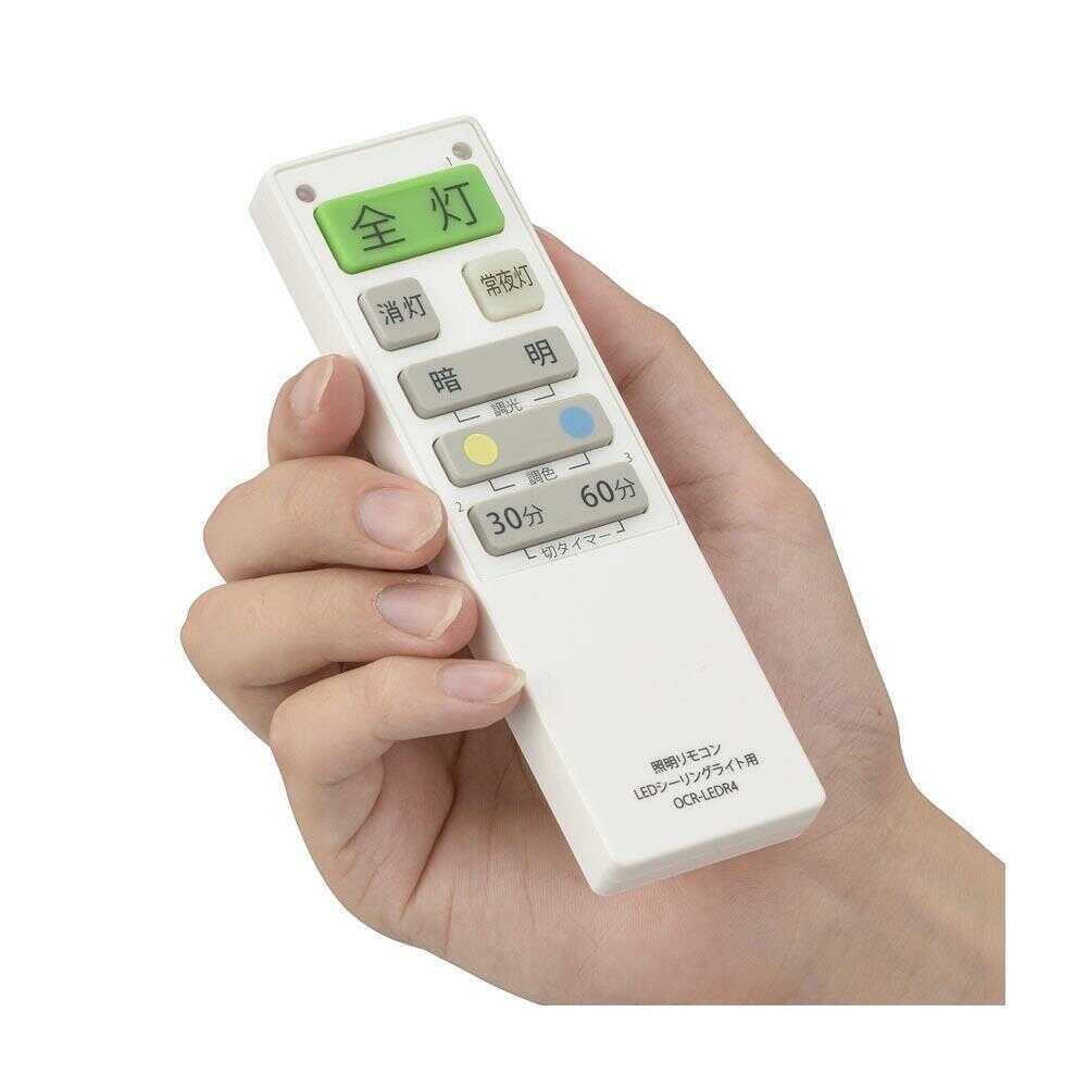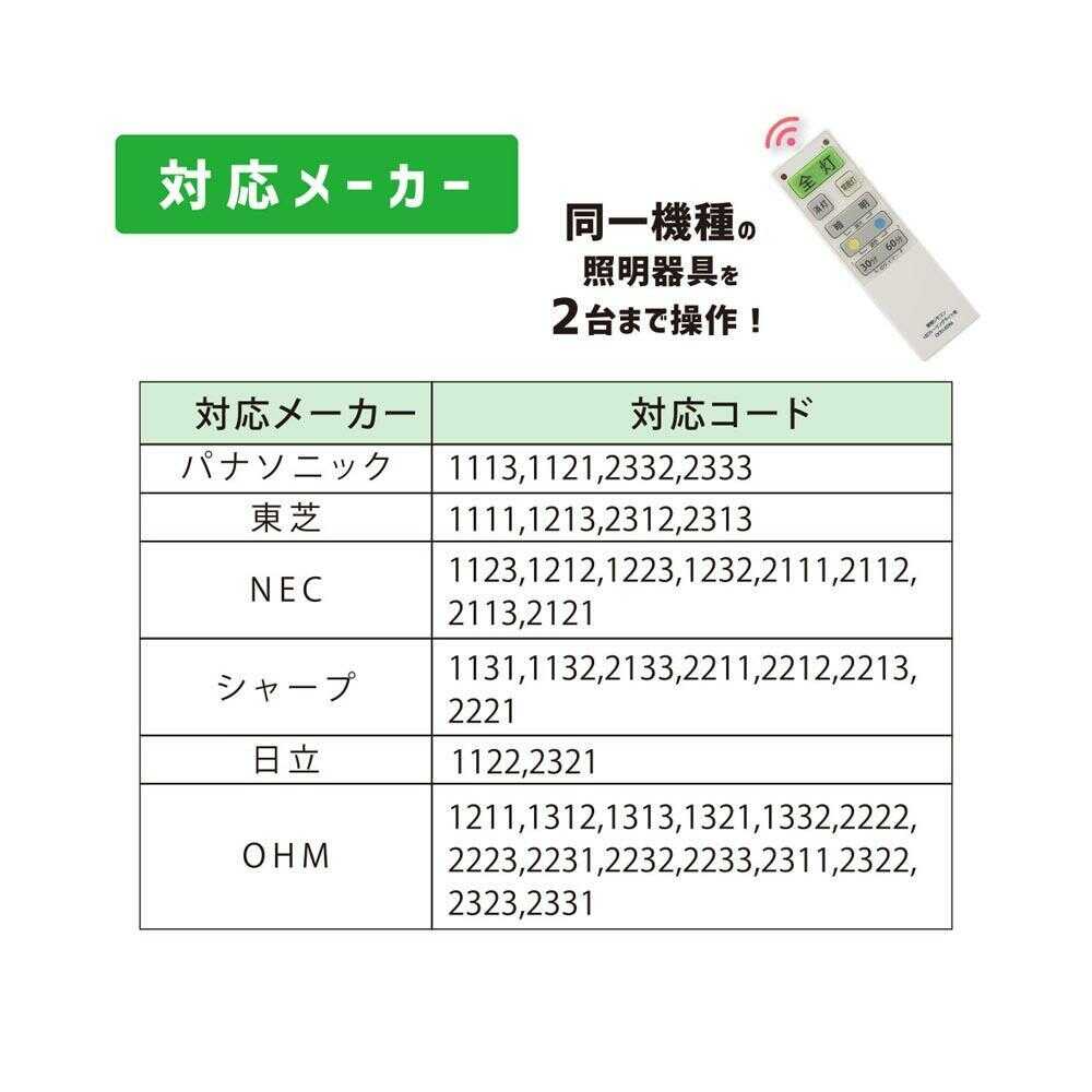 ● リモコン付きLEDシーリングライト専用の照明リモコン ● 国内6社のメーカー(パナソニック・東芝・NEC・シャープ・日立・OHM)に対応しています ● チャンネル切替で、同一機種の照明器具を2台まで操作できます。 ● 調光(明/暗)ボタン、調色(寒色/暖色)ボタン付き ● 全灯・消灯・常夜灯 ボタン付き ● 30分・60分 オフタイマーボタン付き ● 大きなボタンで便利 ● 壁に掛けられるリモコンホルダー付き