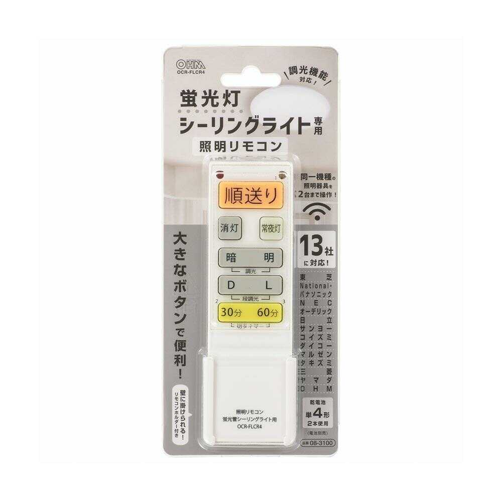 ● リモコン付き蛍光灯シーリングライト専用の照明リモコン ● 国内13社のメーカーに対応 ● チャンネル切替で、同一機種の照明器具を2台まで操作できます。 ● 調光(明/暗)ボタン、順送り(光量100%→60%→常夜灯ON→OFF)ボタン付き ● L/D(光量100%/光量60%)ボタン付き ● 30分・60分 オフタイマーボタン付き ● 常夜灯・消灯 ボタン付き ● 大きなボタンで便利 ● 壁に掛けられるリモコンホルダー付き