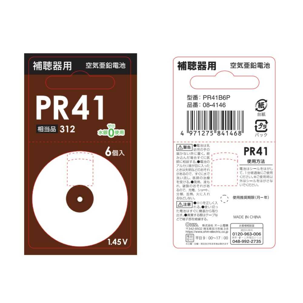 ● 補聴器用空気電池 ● PR41 ● 相当品312 ● 水銀ゼロ使用 ● 使用推奨期限:3年
