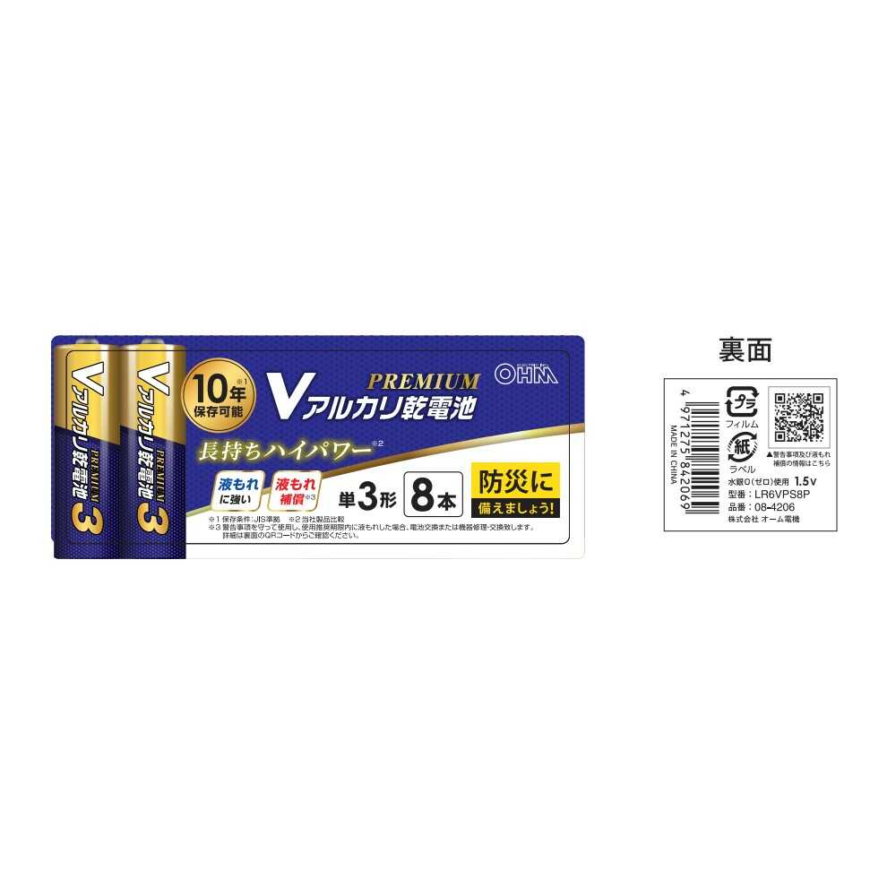 ● 水銀0(ゼロ)使用 ● 10年保存可能(保存条件:JIS準拠) ● 長持ちハイパワー ● 液もれに強い ● 液もれ補償 ● 公称電圧:1.5V ● 単3形 ● 8本パック ● グリーン購入法適合商品