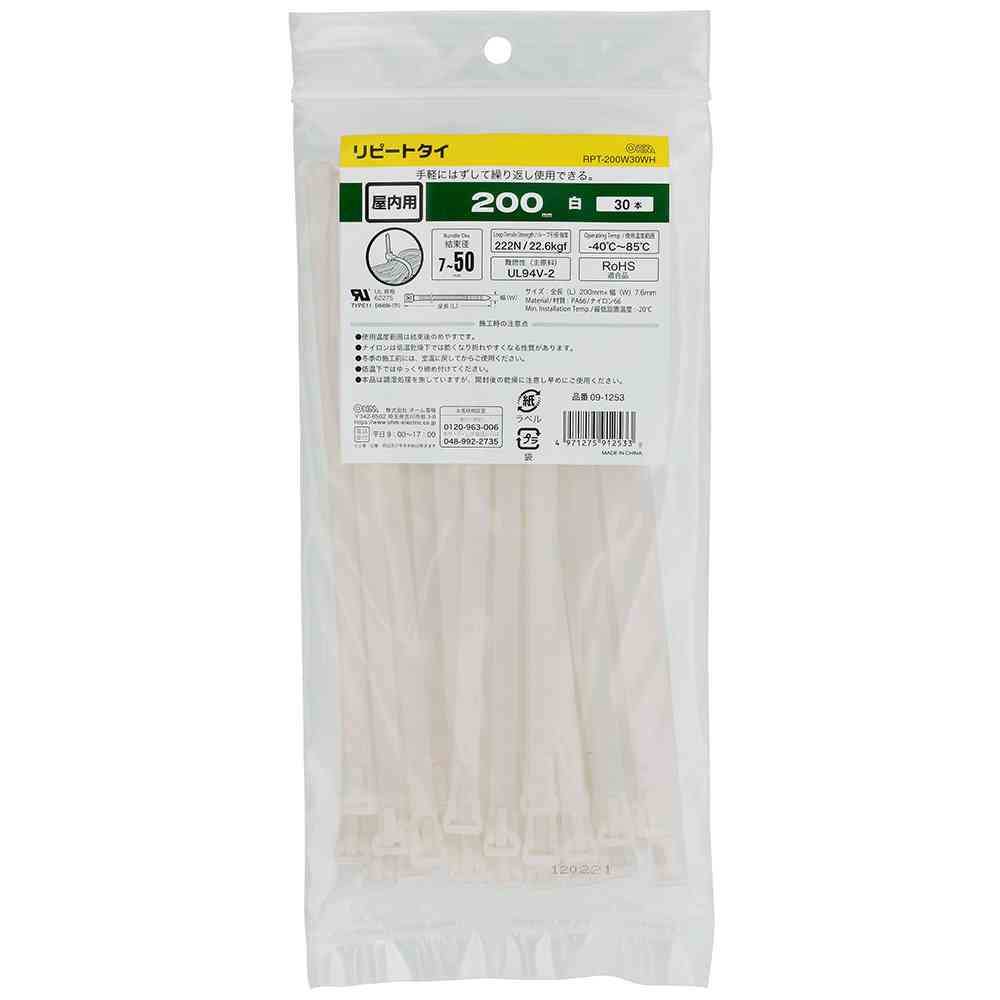● 手軽にはずして繰り返し使用できる ● 屋内用 ● ループ引張強度:222N/22.6kgf ● 難燃性(主原料):UL94V-2 ● 使用温度範囲:-40℃~85℃ ● RoHS適合品 ● 最低設置温度:-20℃