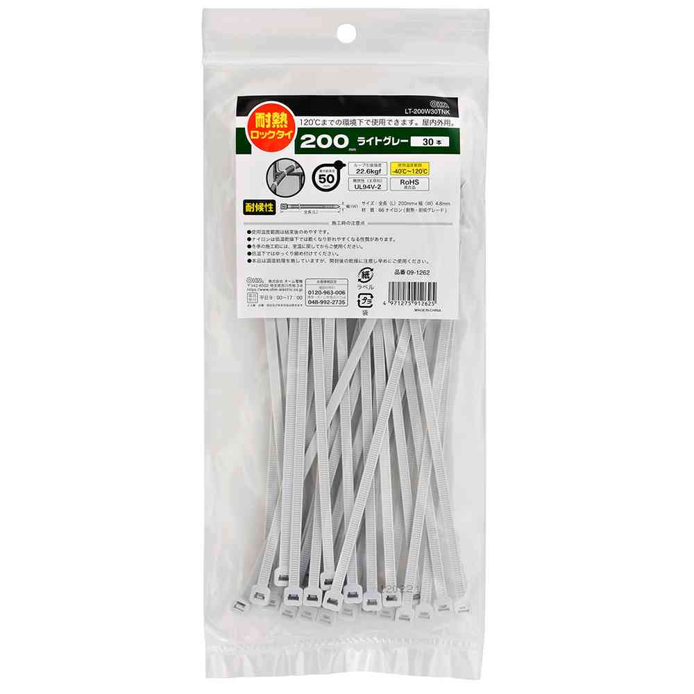 ● 120℃までの環境下で使用できます ● 屋内外用 ● ループ引張強度:22.6kgf ● 難燃性(主原料):UL94V-2 ● 使用温度範囲:-40℃~120℃ ● RoHS適合品