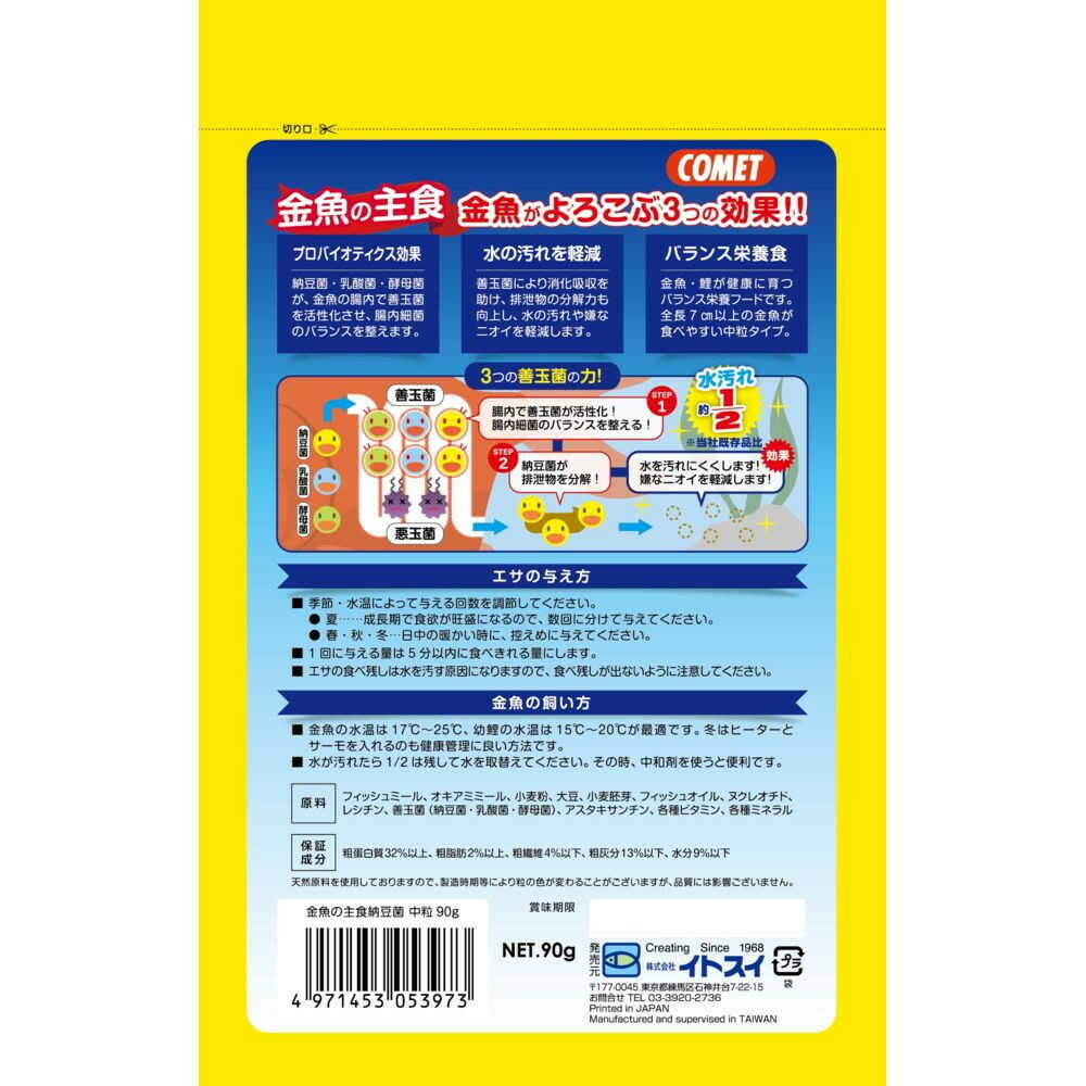 納豆菌、乳酸菌、酵母菌の3つの善玉菌の力で金魚の腸内細菌のバランスを整え、水の汚れや嫌なニオイを減らします。 健康に育つビタミン配合のバランスフードで、浮上性の中粒です。