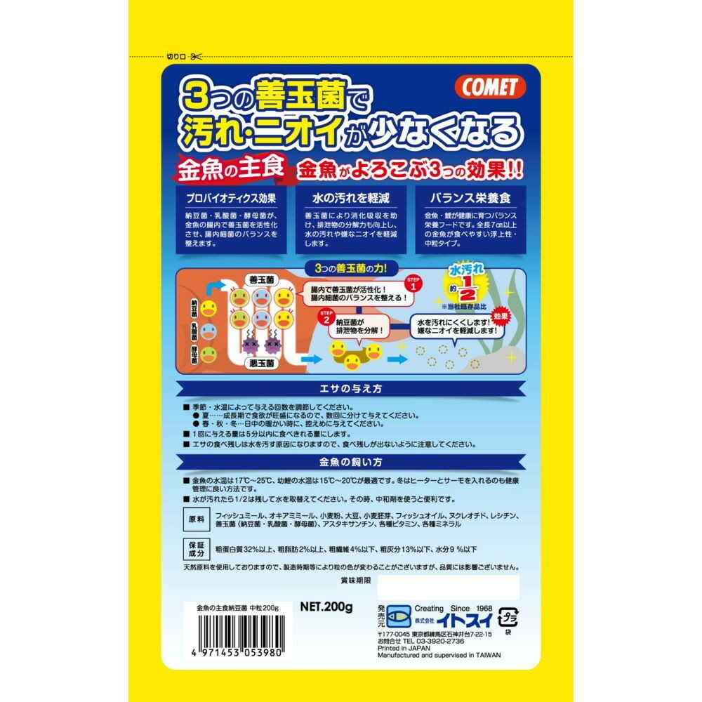 納豆菌、乳酸菌、酵母菌の3つの善玉菌の力で金魚の腸内細菌のバランスを整え、水の汚れや嫌なニオイを減らします。 健康に育つビタミン配合のバランスフードで、浮上性の中粒です。