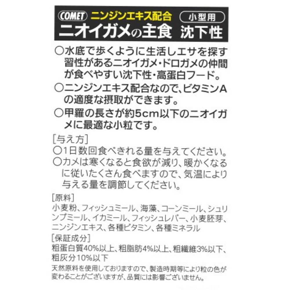 ニンジンエキス配合ですので、カメにとって大切なビタミンAを適度に摂取出来ます。 ニオイガメは水底で歩くようにエサを探す習性がある為、食べやすい沈下性、高たんぱくのフードに仕上げています。