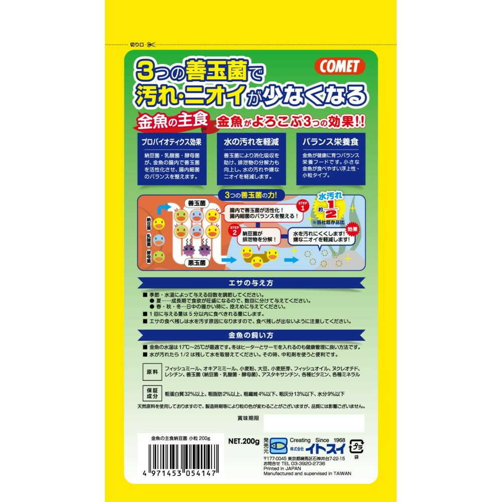 納豆菌、乳酸菌、酵母菌の3つの善玉菌の力で金魚の腸内細菌のバランスを整え、水の汚れや嫌なニオイを減らします。 健康に育つビタミン配合のバランスフードで、小さい金魚に最適な浮上性の小粒です。