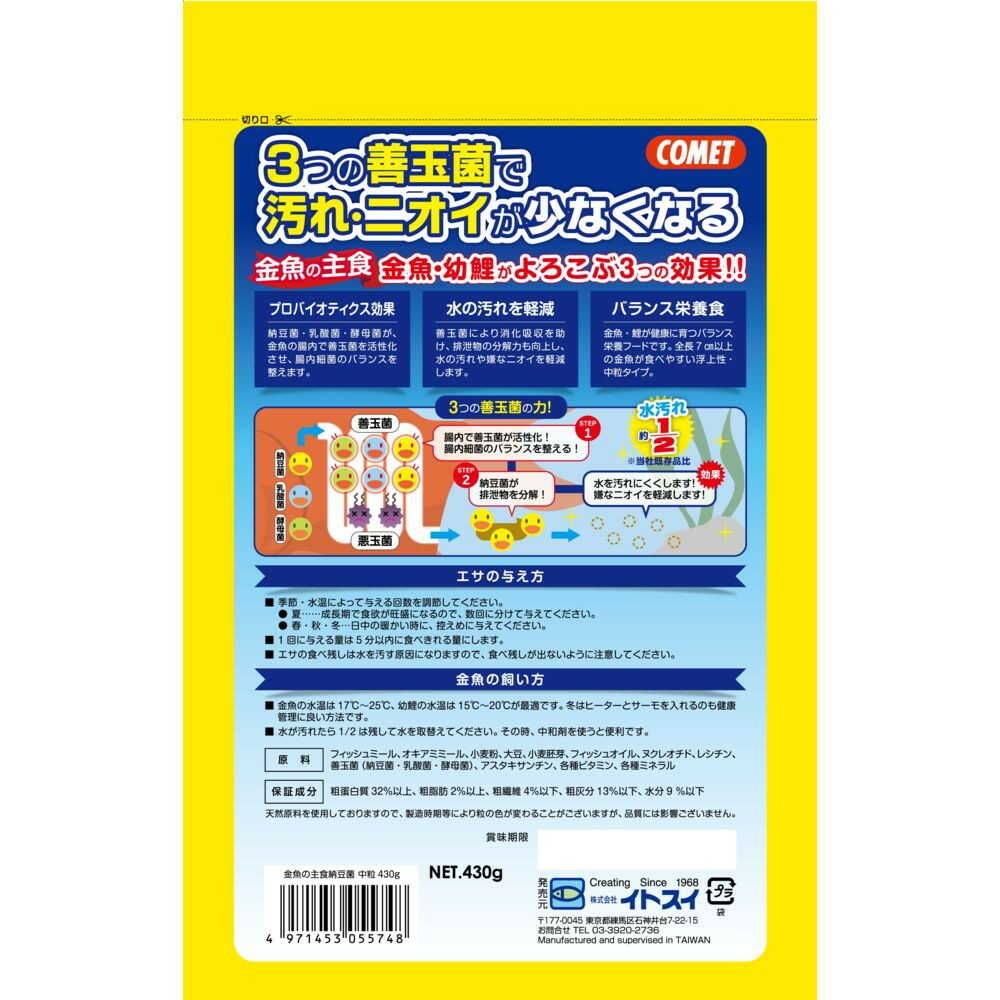 納豆菌、乳酸菌、酵母菌の3つの善玉菌の力で金魚の腸内細菌のバランスを整え、水の汚れや嫌なニオイを減らします。 健康に育つビタミン配合のバランスフードで、浮上性の中粒です。