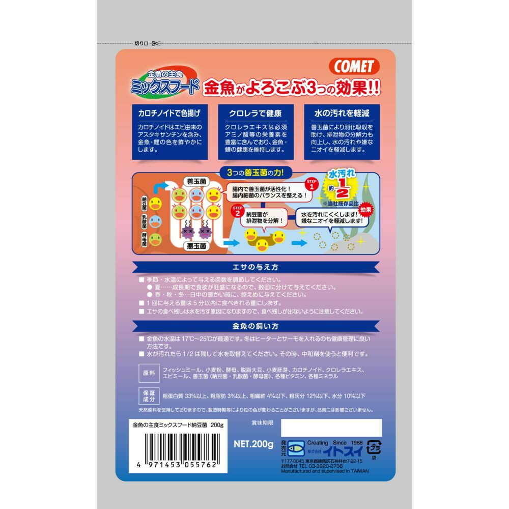 クロレラエキス配合の緑粒とカロチノイド配合の赤粒に納豆菌、酵母菌、乳酸菌の3つの善玉菌を配合し、消化吸収や排泄物の分解力を高め水の汚れや嫌なニオイを減らします。