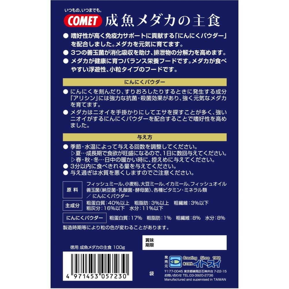 にんにくパウダー配合で嗜好性アップ、抗菌、殺菌効果により強く元気なメダカの育成し、3つの善玉菌で消化吸収を助け、排泄物の分解力を向上します。