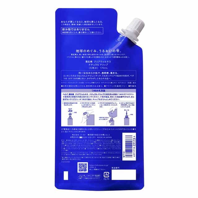 お肌に異常が生じていないかよく注意して使用してください。お肌に合わない時、色抜け(白斑等)や黒ずみ等の異常があらわれた時は、ご使用をおやめください。必ず、雪肌精 クリアウェルネス ナチュラル ドリップの使用済み容器につめかえてください。使用済み容器の内側は洗わないでください。他の製品、異なった製造番号のもの、水と混ぜないでください。つめかえ後は、キャップをきちんとしめてください。