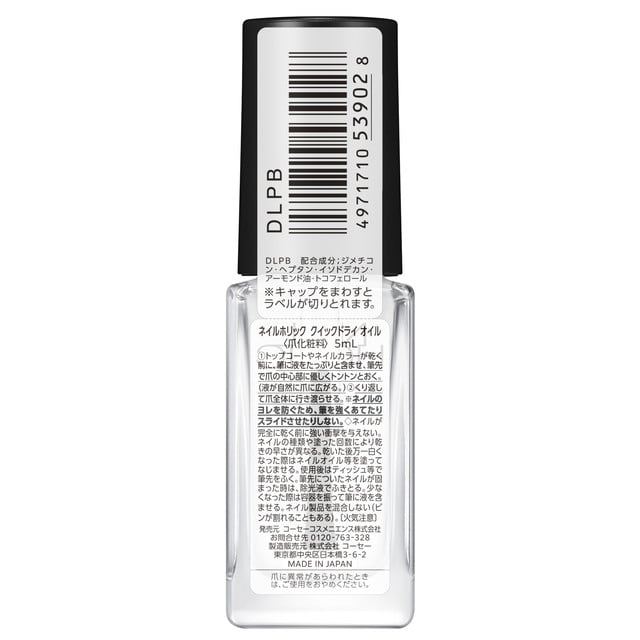 ●ネイルを塗った後に上から重ねるだけで簡単、乾く時間を短縮できる速乾オイル。 ●サラサラとしたオイルでべたつかず、ストレスの少ない使い心地の速乾剤です。 ●3種の異なる揮発性オイルと美容成分のアーモンドオイルをバランスよく配合。爪上でなめらかにのび広がります。 ●前に塗るネイルの質感を損ないにくく、塗りたての仕上がりを保ちます。