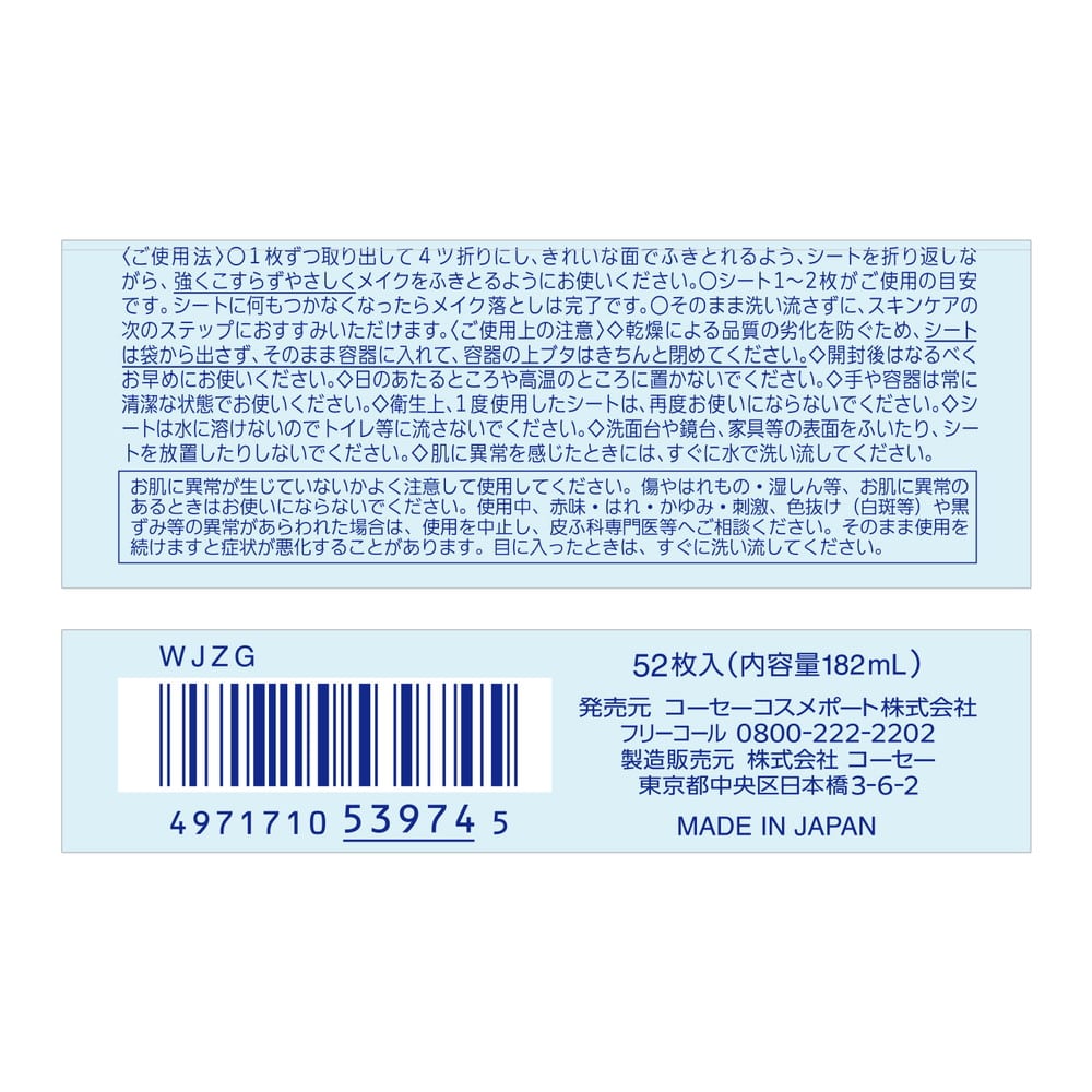 ◇乾燥による品質の劣化を防ぐため、シートは袋から出さず、そのまま容器に入れて、容器の上ブタはきちんと閉めてください。 ◇開封後はなるべくお早めにお使いください。 ◇日のあたるところや高温のところに置かないでください。 ◇手や容器は常に清潔な状態でお使いください。 ◇衛生上、1度使用したシートは、再度お使いにならないでください。 ◇シートは水に溶けないのでトイレ等に流さないでください。 ◇洗面台や鏡台、家具等の表面をふいたり、シートを放置したりしないでください。 ◇肌に異常を感じたときには、すぐに水で洗い流してください。