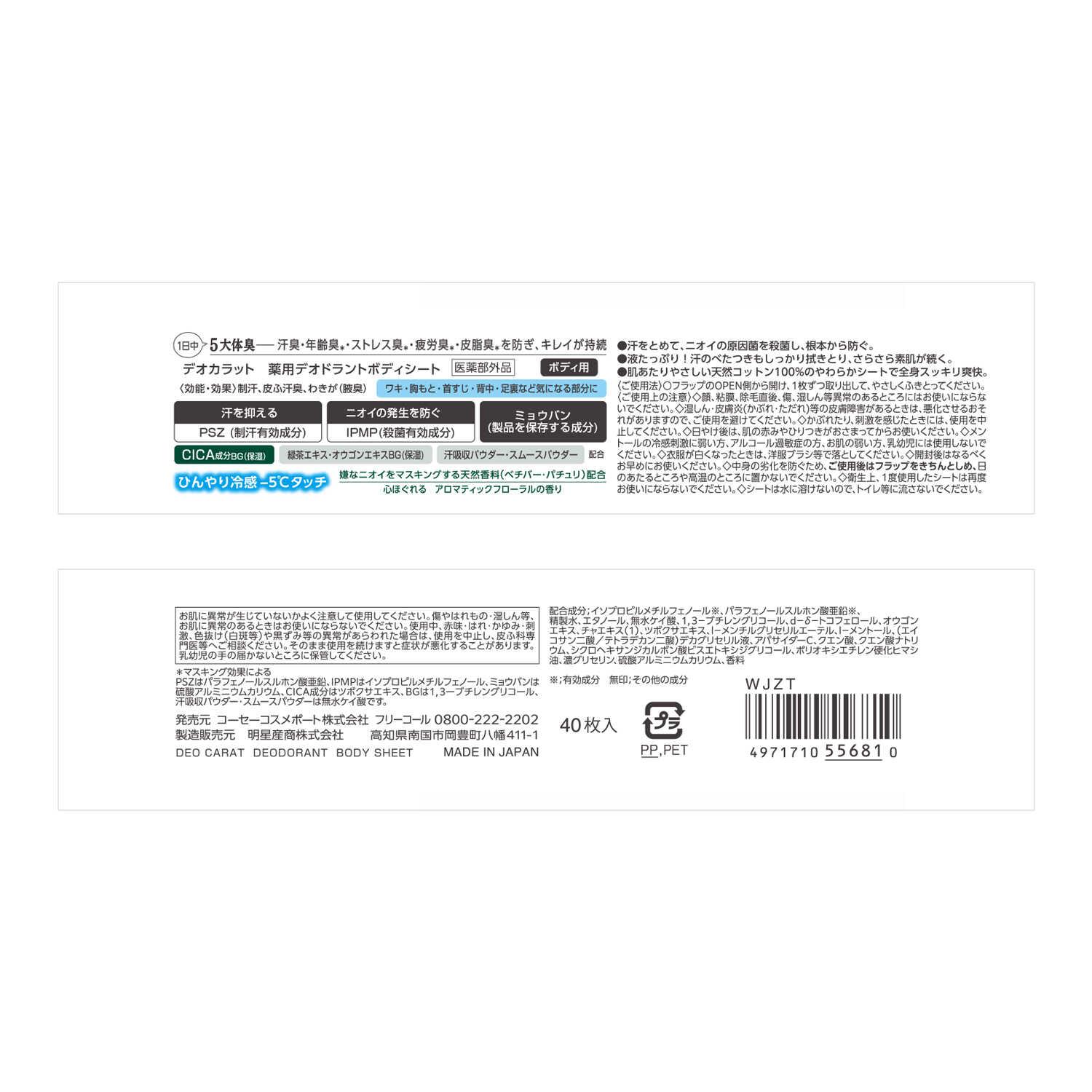 汗をとめてニオイの発生も防ぐ薬用デオドラントボディシート。 液たっぷりで汗のベタつきもしっかり拭きとり、さらさら素肌が続く。 ひんやり冷感-5℃タッチ。 心ほぐれるアロマティックフローラルの香り。