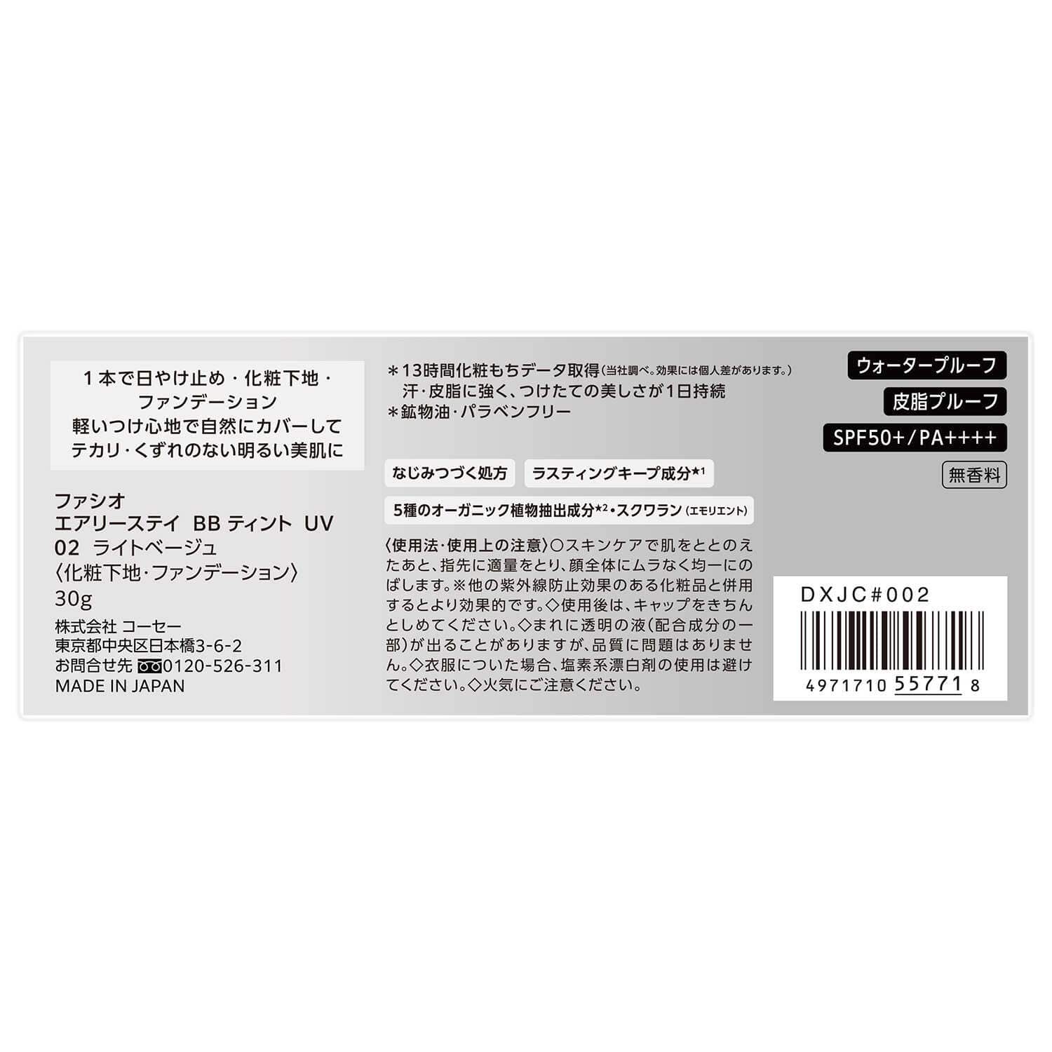 ●汗・水・皮脂・マスク対応。 ●1本でUVカット効果・化粧下地・リキッドファンデーション効果のある、くずれないBBティント。 ●【02 ライトベージュ】