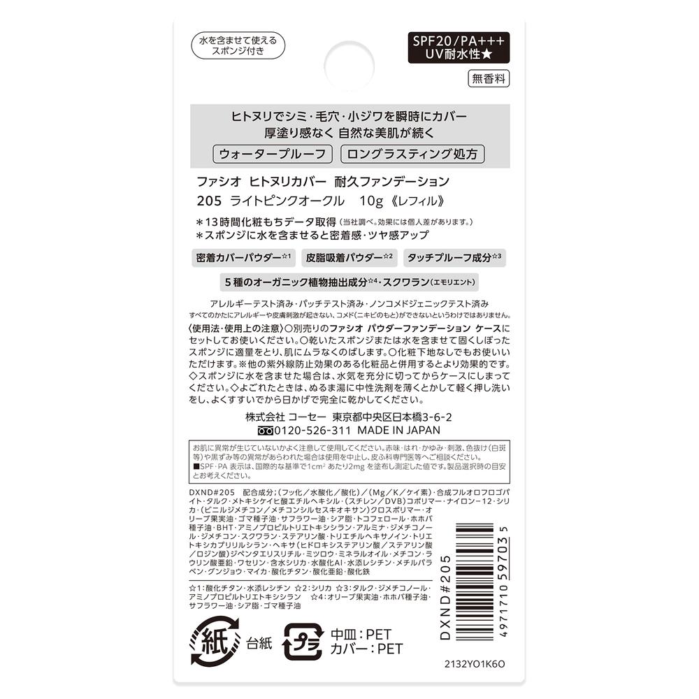 ヒトヌリでシミ・毛穴・小ジワを瞬時にカバー。 厚塗り感なく、自然な美肌がつづく、パウダーファンデーション。 別売りのファシオ パウダーファンデーション ケースにセットしてお使いください。乾いたスポンジまたは水を含ませて固くしぼったスポンジに適量をとり、肌にムラなくのばします。化粧下地なしでもお使いいただけます。他の紫外線防止効果のある化粧品と併用するとより効果的です。