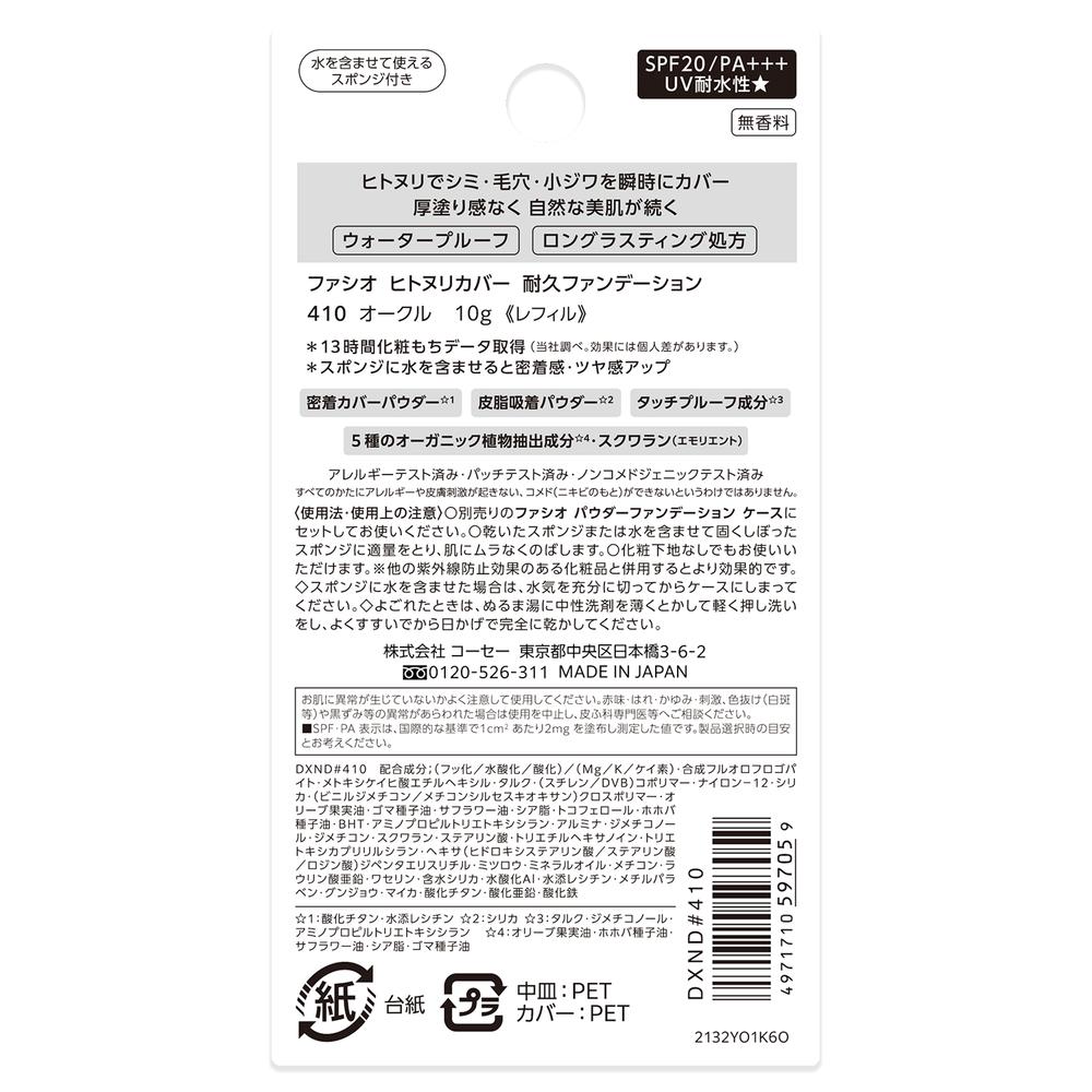 ヒトヌリでシミ・毛穴・小ジワを瞬時にカバー。 厚塗り感なく、自然な美肌がつづく、パウダーファンデーション。 別売りのファシオ パウダーファンデーション ケースにセットしてお使いください。乾いたスポンジまたは水を含ませて固くしぼったスポンジに適量をとり、肌にムラなくのばします。化粧下地なしでもお使いいただけます。他の紫外線防止効果のある化粧品と併用するとより効果的です。