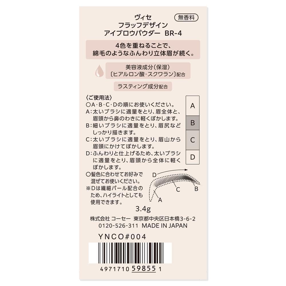 4色でふんわり抜け感眉に仕上げるアイブロウパウダー。 上の色から順に使うだけで、簡単にこなれ眉が完成。 A・B・C・Dの順にお使いください。A : 太いブラシに適量をとり、眉全体と、眉頭から鼻のわきに軽くぼかします。B : 細いブラシに適量をとり、眉尻などしっかり描きます。C : 太いブラシに適量をとり、眉山から眉頭にかけてぼかします。D : ふんわりと仕上げるため、太いブラシに適量をとり、眉頭から全体に軽くぼかします。髪色にあわせてお好みで混ぜてお使いください。Dは繊細パール配合のため、ハイライトとしても使用できます。
