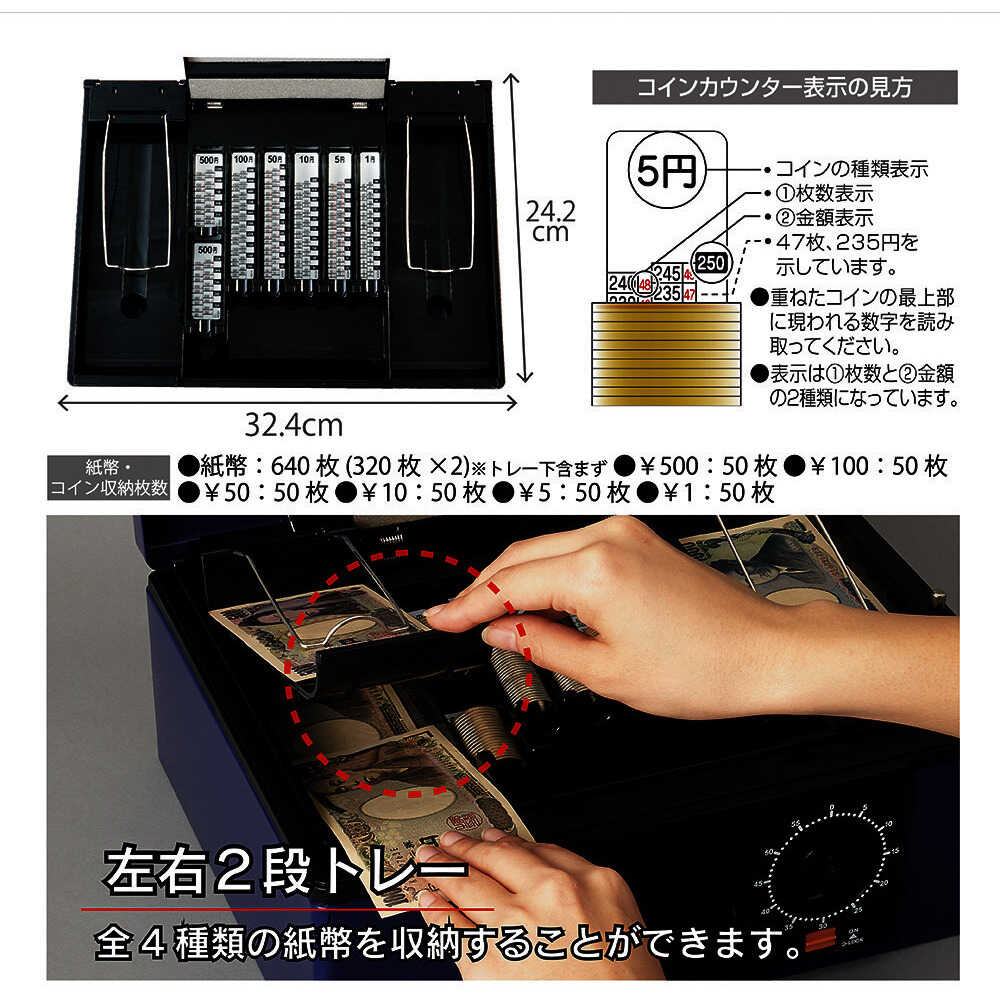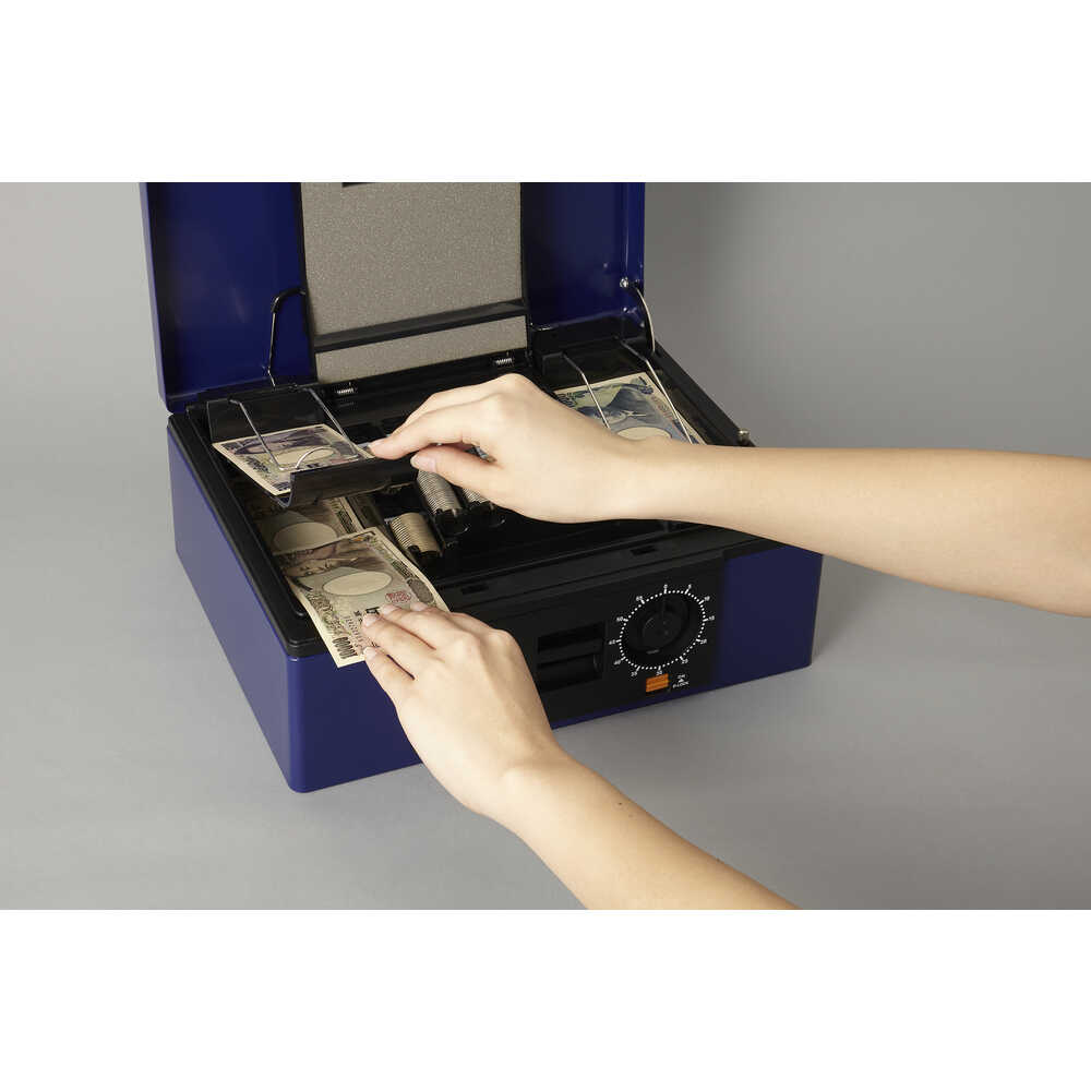 ●シリンダー錠とダイヤル錠の二重ロックで管理は万全です。●スポンジ付き内蓋により、持ち運び時に硬貨が飛散しません。●ダイヤルロック機能により、不用意なダイヤル操作を防ぎます。●左右の紙幣用トレーは2段式で4種類の紙幣を収納できます。●トレーは積み重ねた硬貨の枚数と合計金額が確認できるコインカウンター付きです。●一時的な伝票整理に最適な書類押さえを装備しています。●トレーの下は領収書や契約書、認印等が収納できるフリースペースです。●容量(L):4.5●色:ブルー●本体寸法(mm)間口:349●本体寸法(mm)奥行:276●本体寸法(mm)高さ:134●有効内寸(mm)間口:313●有効内寸(mm)奥行:224●有効内寸(mm)高さ:65●収納書類サイズ:A4サイズ●施錠:シリンダー錠、ダイヤル錠●仕様:ダイヤルロック機能、紙幣二段トレー、硬貨飛散防止、書類押さえ●硬貨収納枚数:500円50枚、100円50枚、50円50枚、10円50枚、5円50枚、1円50枚●紙幣二段トレー●ダイヤルロック機能●硬貨飛散防止●コインカウンター付きトレー 質量3.6kg