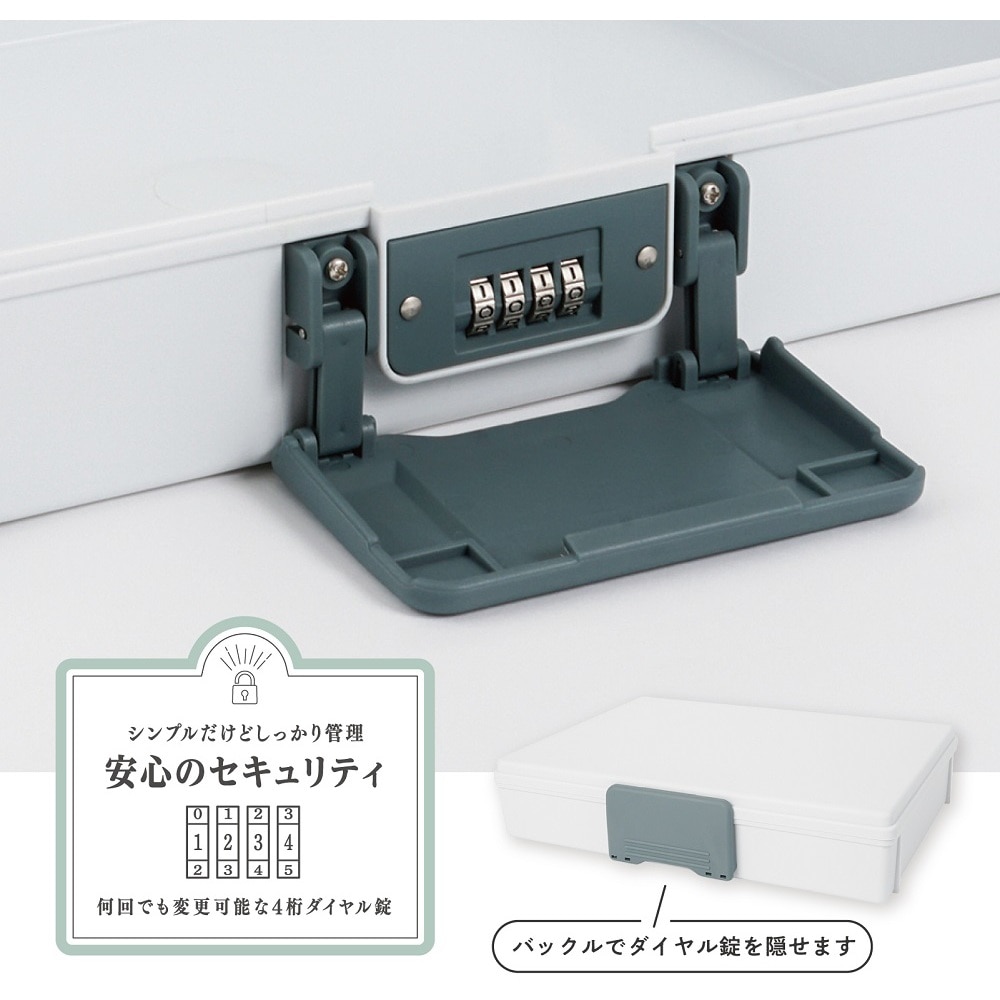 ●角形2号封筒を折らずにそのまま保管できる収納力です。●本体は軽くて取り扱いやすいプラスチック製です。●鍵の紛失の心配がない4桁のダイヤル錠です。●10000通りからお好きな番号を何度でも設定できます。●ダイヤルで施錠しなくてもバックルを閉じることで、待ち運び時に上蓋が開くことはありません。●バックルでダイヤル部分を覆い隠せるので目に見える場所においても部屋に馴染みます。●容量(L):5.6●色:ホワイト●本体寸法(mm)間口:370●本体寸法(mm)奥行:286●本体寸法(mm)高さ:77●有効内寸(mm)間口:350●有効内寸(mm)奥行:238●有効内寸(mm)高さ:68●収納書類サイズ:A4サイズ●施錠:4桁ダイヤル錠(任意設定可能)●角形2号封筒収納可能●お好みの番号が設定できる4桁ダイヤル 質量970g