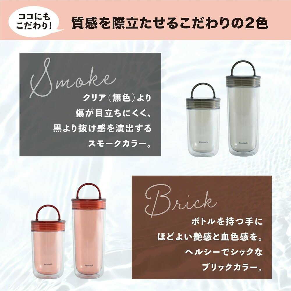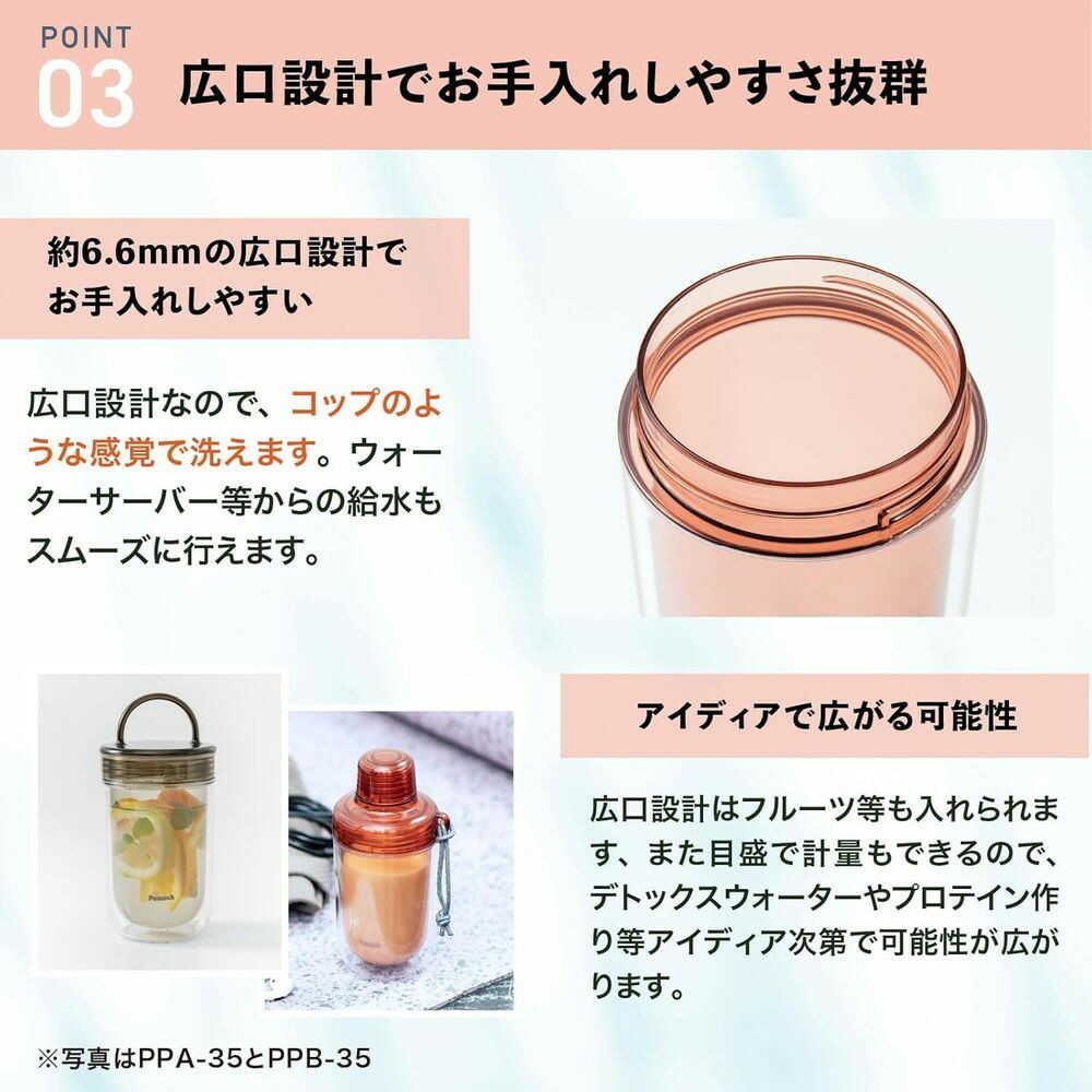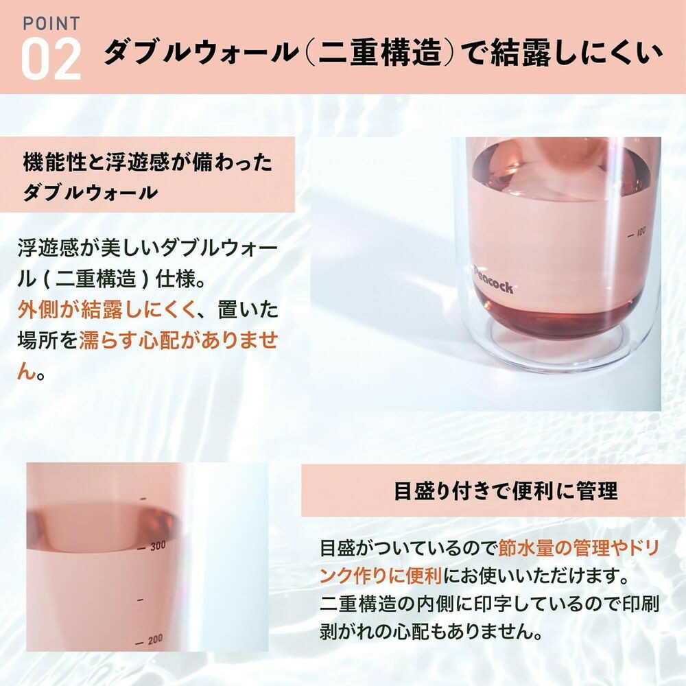 ●結露しにくいダブルウォール構造 ●持ち運びに便利なハンドル付き ●広口なのでお手入れがしやすく、注いだ量や飲んだ量が分かりやすい目盛りが付き