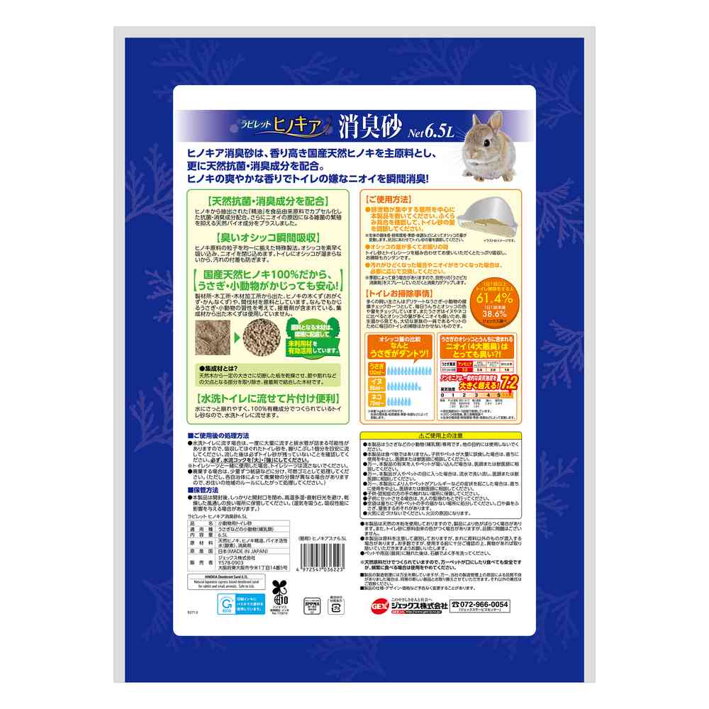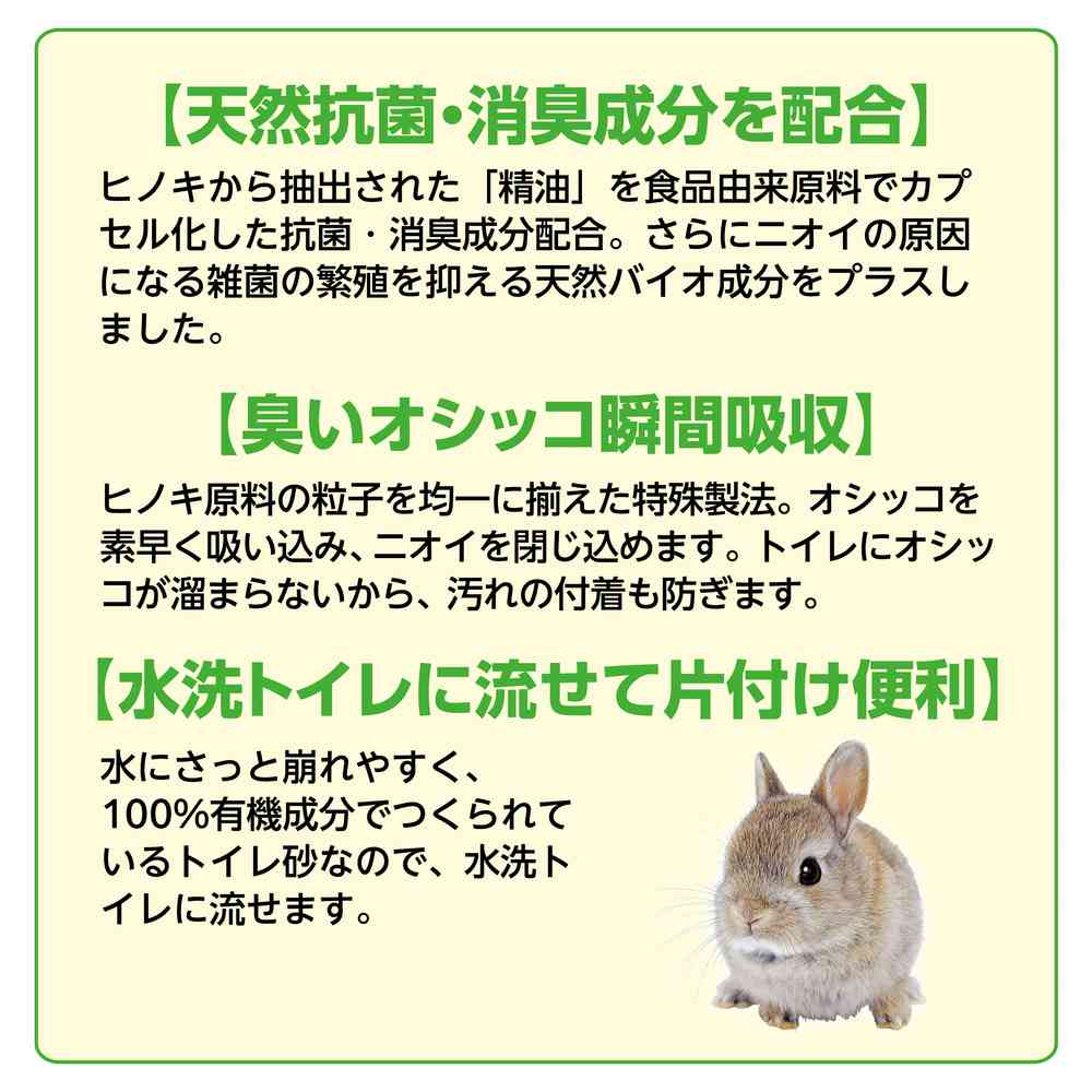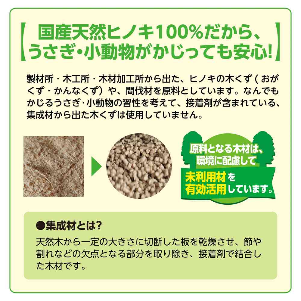 国産天然ヒノキ100%!うさぎ・小動物がかじっても安心! ヒノキから抽出された食品由来原料で,抗菌・消臭成分に臭いの原因になる雑菌の繁殖を抑える天然バイオ成分をプラス! 特殊製法でヒノキ原料の粒子を均一に揃え,オシッコを素早く吸収,ニオイやトイレ汚れの付着を防ぎます水にもさっと崩れやすく,100%有機成分でつくられている天然原料だから水洗トイレに流せて便利 トイレやケージの引出しトレイに敷き詰めるだけ。