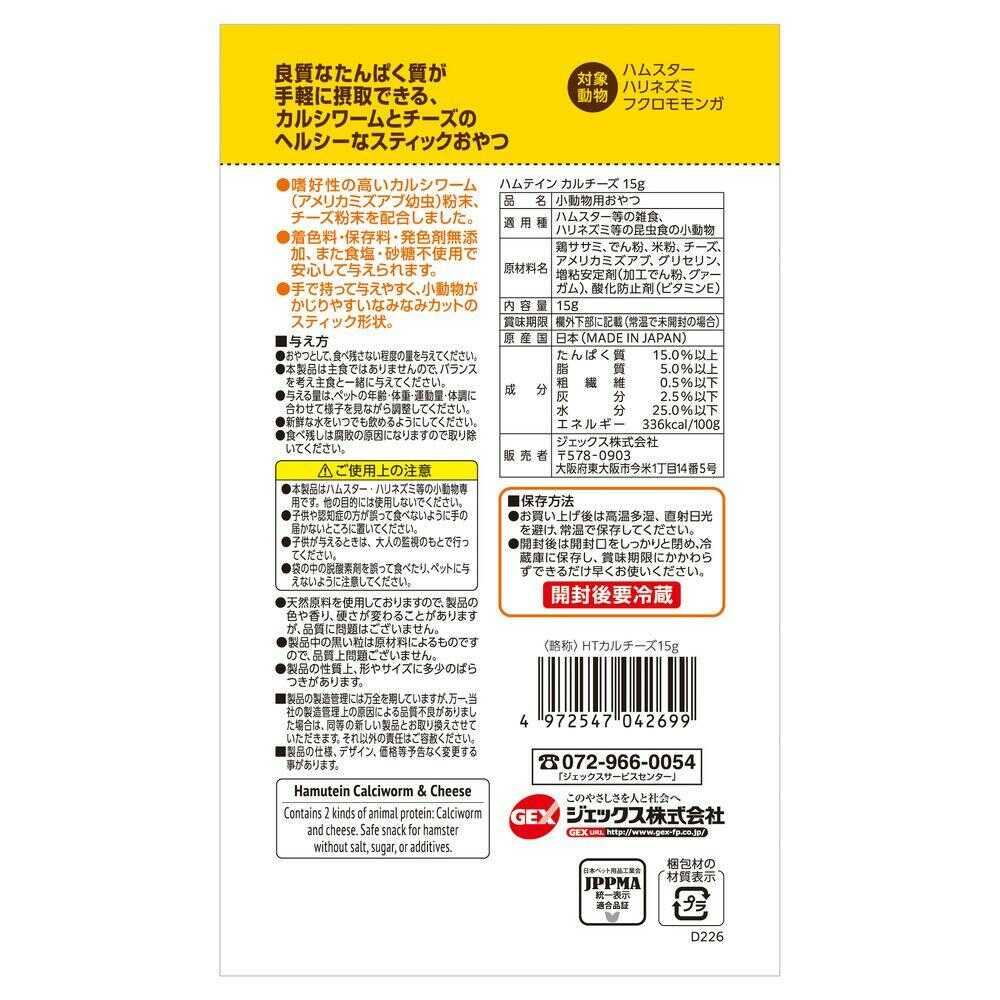 良質なたんぱく質が手軽に摂取できる、カルシワームとチーズのヘルシーなスティックおやつ。 嗜好性の高いカルシワーム(アメリカミズアブ幼虫)粉末、チーズ粉末を配合しました。 着色料・保存料・発色剤無添加、また食塩・砂糖不使用で安心して与えられます。 手で持って与えやすく、小動物がかじりやすい波波カットのスティック形状。