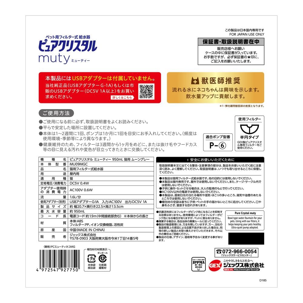 - > ジェックス ピュアクリスタルミューティー猫 950ml