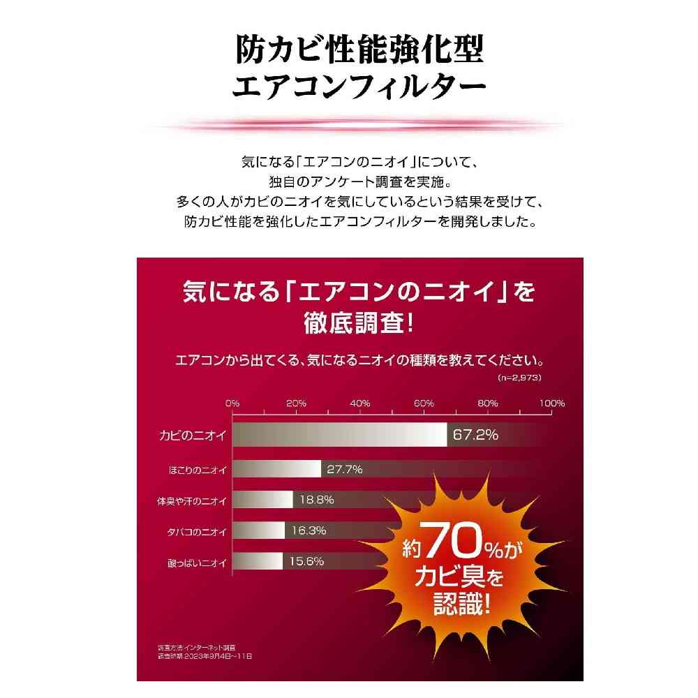 ・圧倒的防カビ性能を実現した驚きのエアコンフィルター ・高性能三層構造により、花粉やPM2.5など気になる粉塵をしっかりブロックします。 ・活性炭&ゼオライトの添加による強力脱臭、抗菌・抗ウイルスなど、多くの機能を備えています。 <除去可能な対象物> カビの胞子、細菌、ウイルス、チリ・ホコリ・PM2.5、花粉、ダニ、タバコ臭、ペット臭、排ガス臭など ※対象物のすべてを除去できるものではありません。