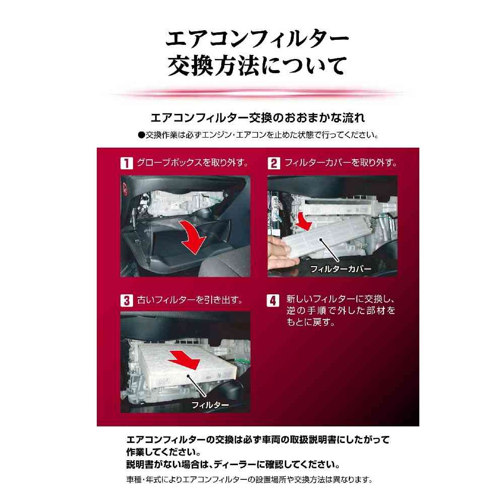 ・ご購入の際は、必ず最新の適合情報を確認してください。 ・事故防止のため、交換作業は必ずエンジン・エアコンを止めた状態で行ってください。 ・本製品はフィルターの交換方法を記載した説明書を同梱していません。交換方法は、車両の取扱説明書で確認してください。 ・交換後は、エアコンを作動させ、異常がないことを確認してください。交換後風量が著しく減少する場合は、エアコンの故障原因となるため、使用を中止してください。 ・フィルターの再使用はできません。 ・フィルターを取り外したままにしないでください。 ・フィルターを交換してもエアコンの風が臭う場合は、エバポレーターが汚れている可能性があります。専門の業者でエバポレ-タ-の洗浄を行うことをおすすめします。 ・カーエアコンのフィルター以外の用途では使用しないでください。 ・活性炭の特性上、一度吸着した臭気成分を放出するため、ごくまれに異臭を感じる場合があります。 ・使用済みのフィルターは、各自治体の定める分別方法に従って廃棄してください。