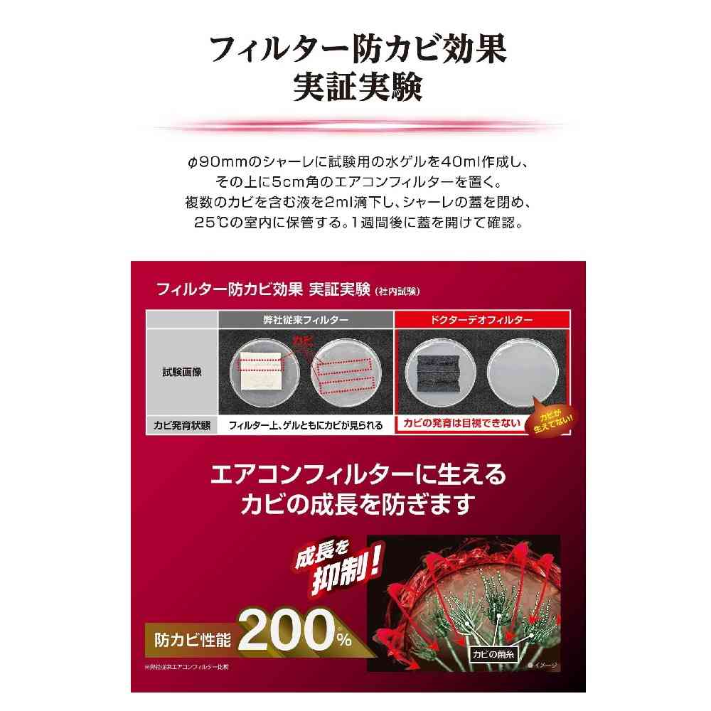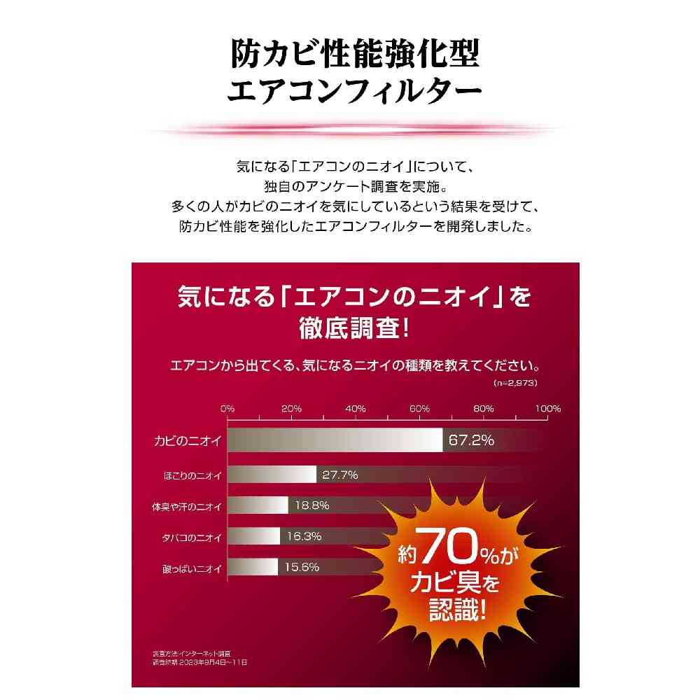 ・圧倒的防カビ性能を実現した驚きのエアコンフィルター ・高性能三層構造により、花粉やPM2.5など気になる粉塵をしっかりブロックします。 ・活性炭&ゼオライトの添加による強力脱臭、抗菌・抗ウイルスなど、多くの機能を備えています。 <除去可能な対象物> カビの胞子、細菌、ウイルス、チリ・ホコリ・PM2.5、花粉、ダニ、タバコ臭、ペット臭、排ガス臭など ※対象物のすべてを除去できるものではありません。