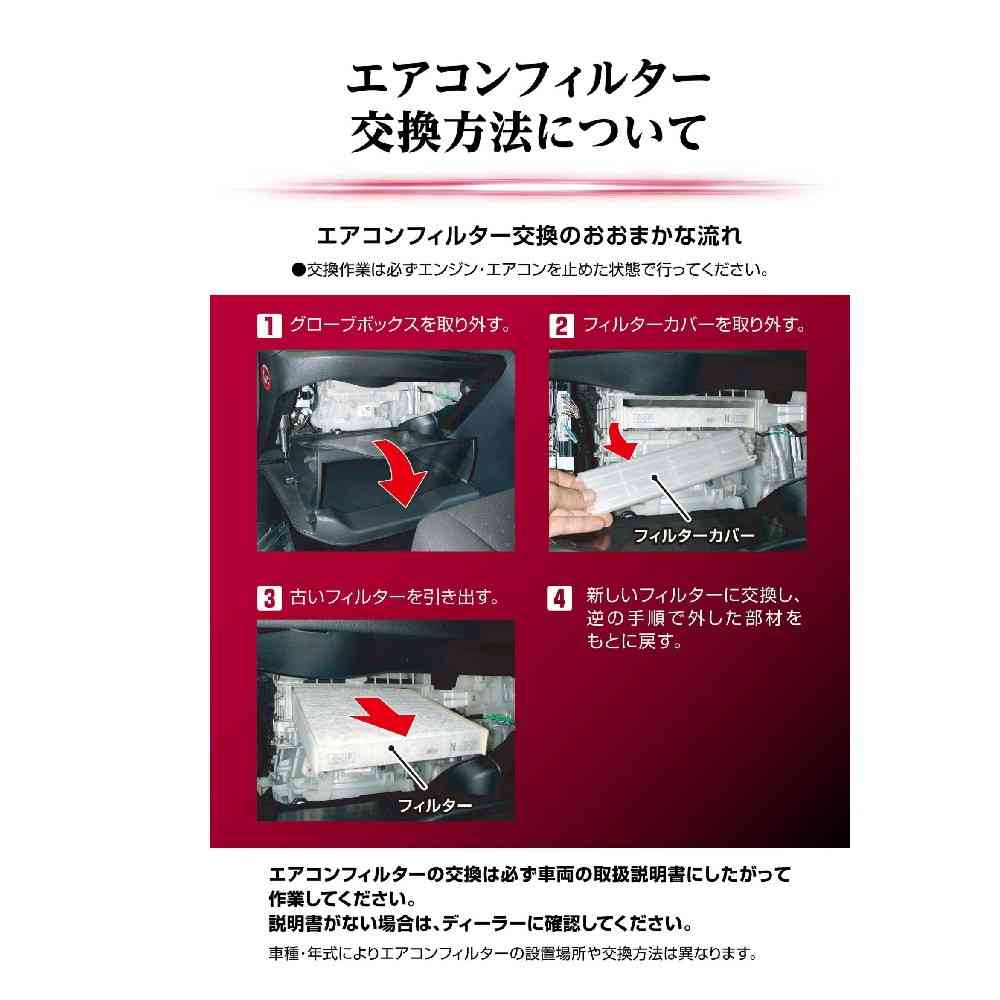 ・ご購入の際は、必ず最新の適合情報を確認してください。 ・事故防止のため、交換作業は必ずエンジン・エアコンを止めた状態で行ってください。 ・本製品はフィルターの交換方法を記載した説明書を同梱していません。交換方法は、車両の取扱説明書で確認してください。 ・交換後は、エアコンを作動させ、異常がないことを確認してください。交換後風量が著しく減少する場合は、エアコンの故障原因となるため、使用を中止してください。 ・フィルターの再使用はできません。 ・フィルターを取り外したままにしないでください。 ・フィルターを交換してもエアコンの風が臭う場合は、エバポレーターが汚れている可能性があります。専門の業者でエバポレ-タ-の洗浄を行うことをおすすめします。 ・カーエアコンのフィルター以外の用途では使用しないでください。 ・活性炭の特性上、一度吸着した臭気成分を放出するため、ごくまれに異臭を感じる場合があります。 ・使用済みのフィルターは、各自治体の定める分別方法に従って廃棄してください。
