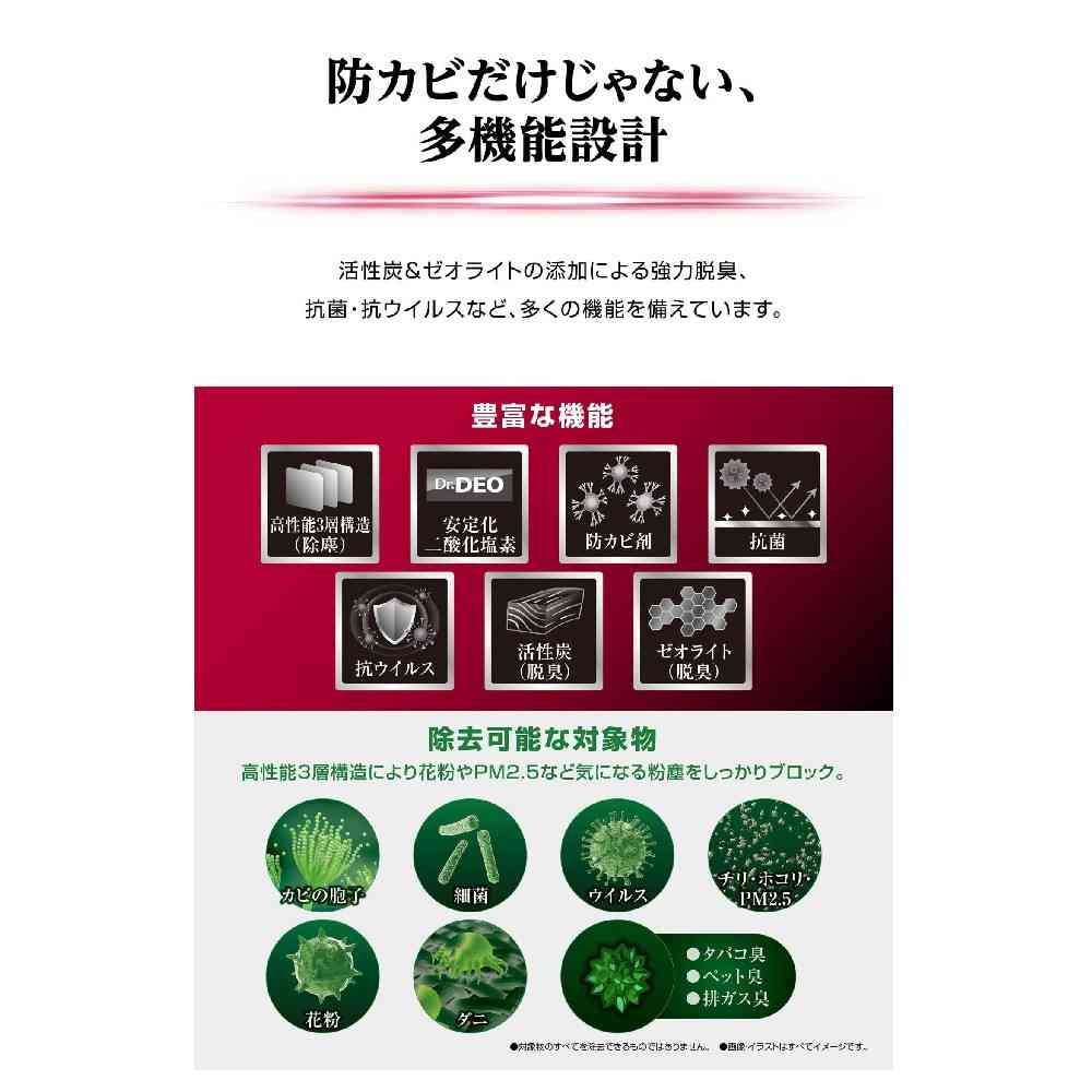 ・圧倒的防カビ性能を実現した驚きのエアコンフィルター ・高性能三層構造により、花粉やPM2.5など気になる粉塵をしっかりブロックします。 ・活性炭&ゼオライトの添加による強力脱臭、抗菌・抗ウイルスなど、多くの機能を備えています。 <除去可能な対象物> カビの胞子、細菌、ウイルス、チリ・ホコリ・PM2.5、花粉、ダニ、タバコ臭、ペット臭、排ガス臭など ※対象物のすべてを除去できるものではありません。