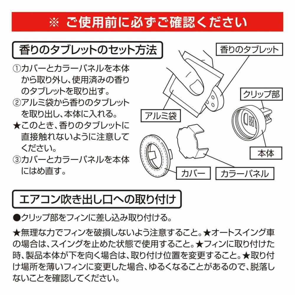 エアコン取り付けタイプのカーフレグランスに使用できる、タブレットタイプの詰め替えです。 ご購入前に、対応する製品をよくご確認いただいた上でお求めください。 約30日持続します。※持続期間は使用環境により前後します。 対応製品:H1751~4ブラングエアセレクトシリーズ ※2024年3月時点 ホワイトムスクの香り:洗練されたホワイトフローラルをベースに、心地よいフルーツがアクセントとなり、上質なムスクが優しく全体を包み込みます。