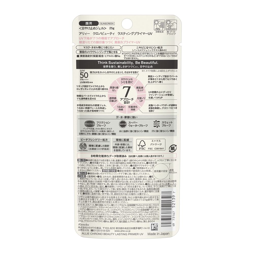 ●UV下地が7つの機能でアプローチ ●朝塗りたての顔印象つづく 美耐久プライマーUV ●マスク・タオル等につきにくい ●普段のメイククレンジングで落とせる ●ニキビになりにくい処方(ノンコメドジェニックテスト済み※) ※コメド(ニキビのもと)のできにくいことを確認するテストです。すべての方にコメド(ニキビのもと)ができないというわけではありません。 ●SPPA++++UV耐水性。日やけによるシミを防ぎます。 強力にUVをカットし、日やけによるシミ、そばかすを防ぎ厚塗り感がありません。 ●リタッチ設計でメイクの上からヨレずにキレイにUVを塗り直せます。 透明感印象UP。微細なパールでメイクの上からでも透明感を足せる、うるおい持続水相成分約65%の密着ジェル。 ■ 美容液成分(保湿)配合 ヒアルロン酸Na
