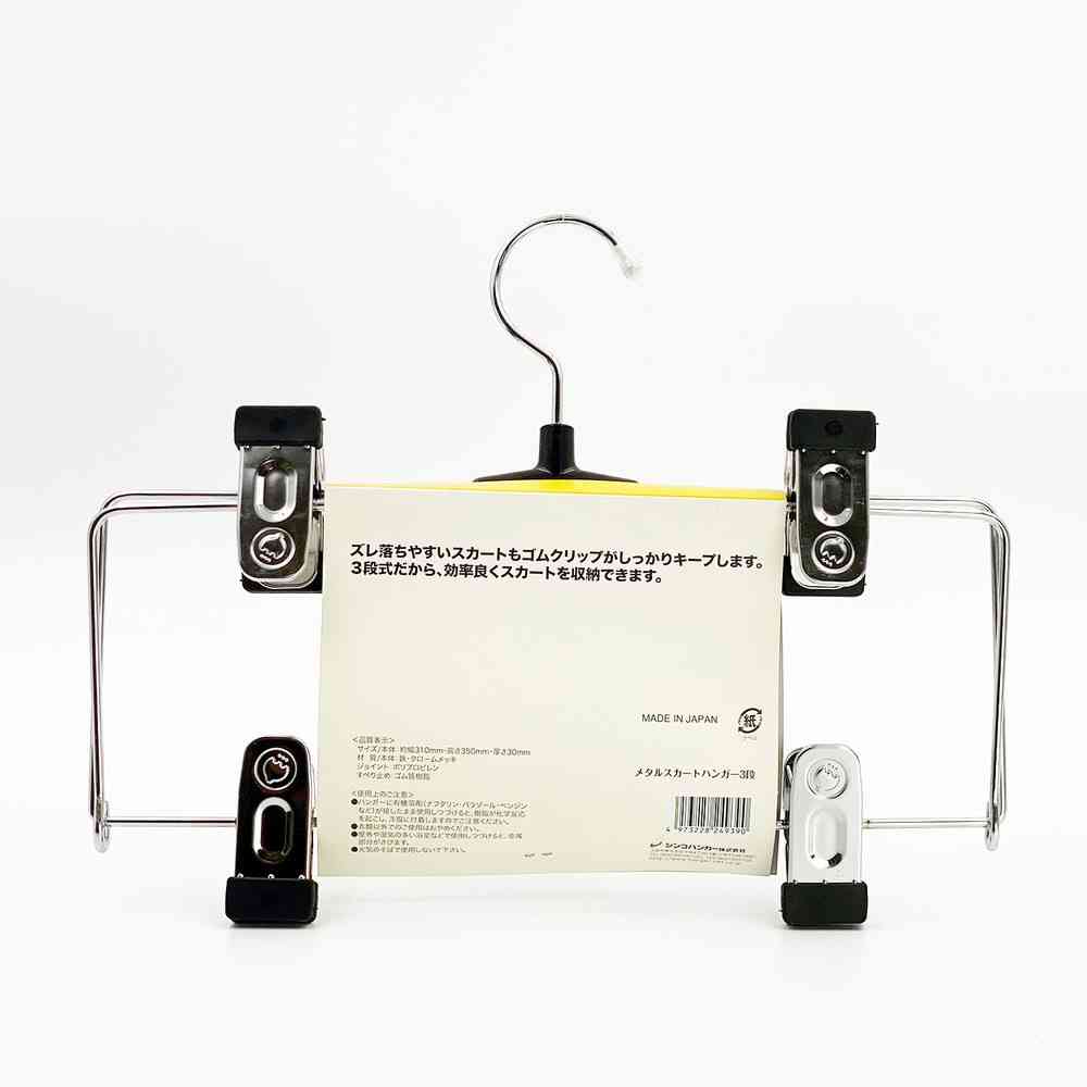金属製クリップでボトムをしっかり固定できる、3枚掛け・3段式の金属製スカート用ハンガーです。 スカートを3本まとめてクリップでき、効率よく収納できます。 クリップの先端にはゴム製のすべり止めが付いており、スカートをしっかりキャッチします。 クリップ跡が残りにくいのも特長です。 フックは回転式で、中央の前フックにはベルトなどを掛けることもできます。