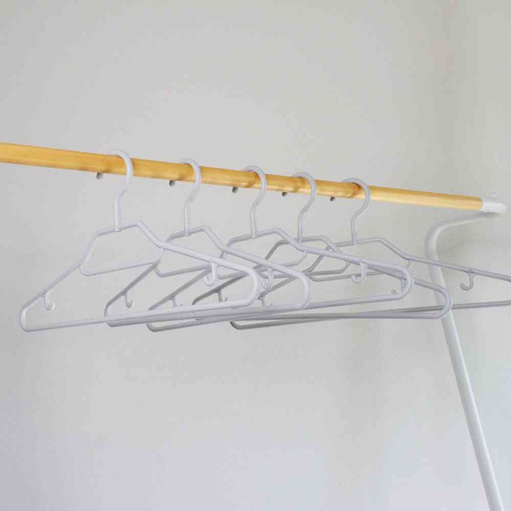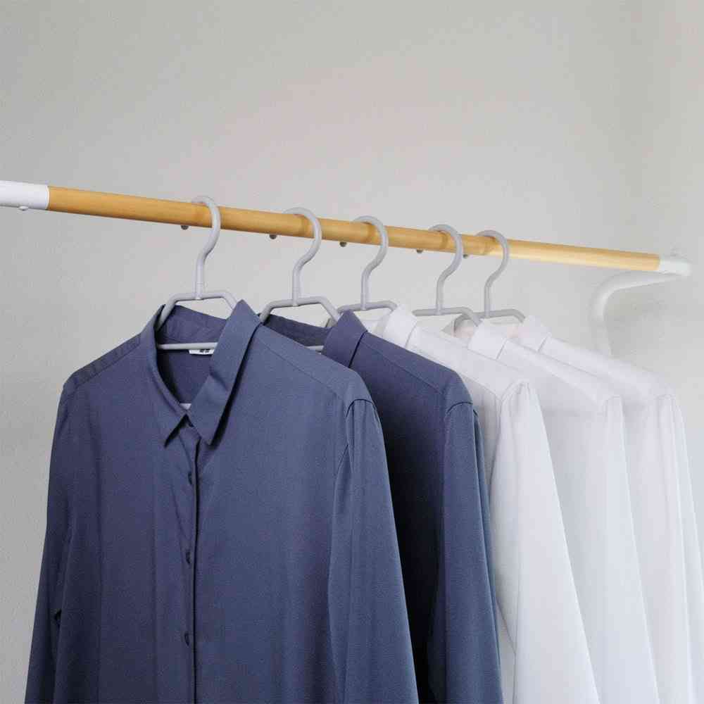 衣類収納をライフスタイルに合わせてトータルコーディネートできるハンガーです。 襟部分が持ち上がった立体形状で、シャツの襟元がヨレにくく、形をしっかりキープします。 ハンガーの太さは約8mm。薄型ながらしっかりしており、ふにゃふにゃしません。 左右の穴あき部分には、キャミソールなどの紐も掛けられます。 フックは回転式で、向きを自由に変えられます。