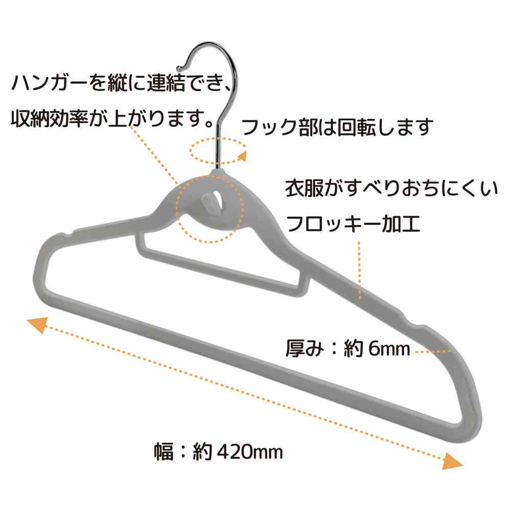 衣類収納をライフスタイルに合わせてトータルコーディネートフロッキー加工で、洋服がずれ落ちにくいハンガーです。 連結機能もあるので、普段使いだけではなく、収納にも役立つハンガーです。 フックは回転し、向きを変えられます。
