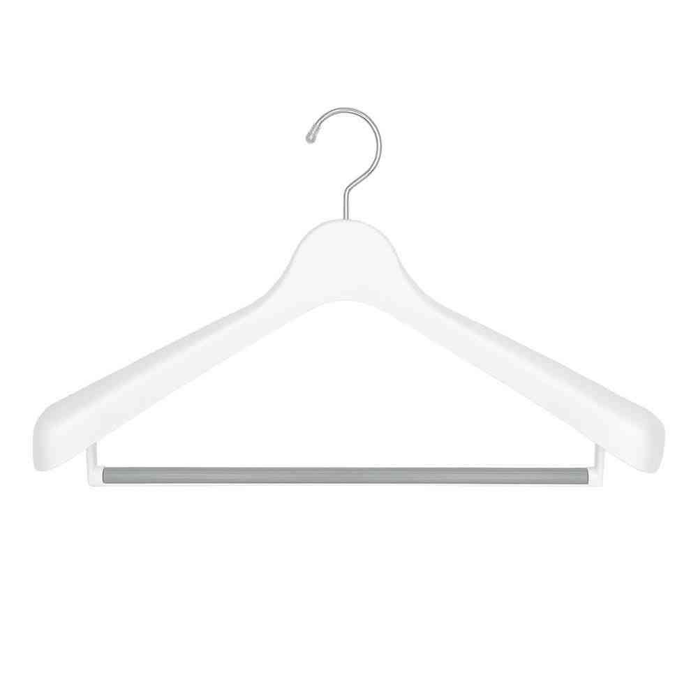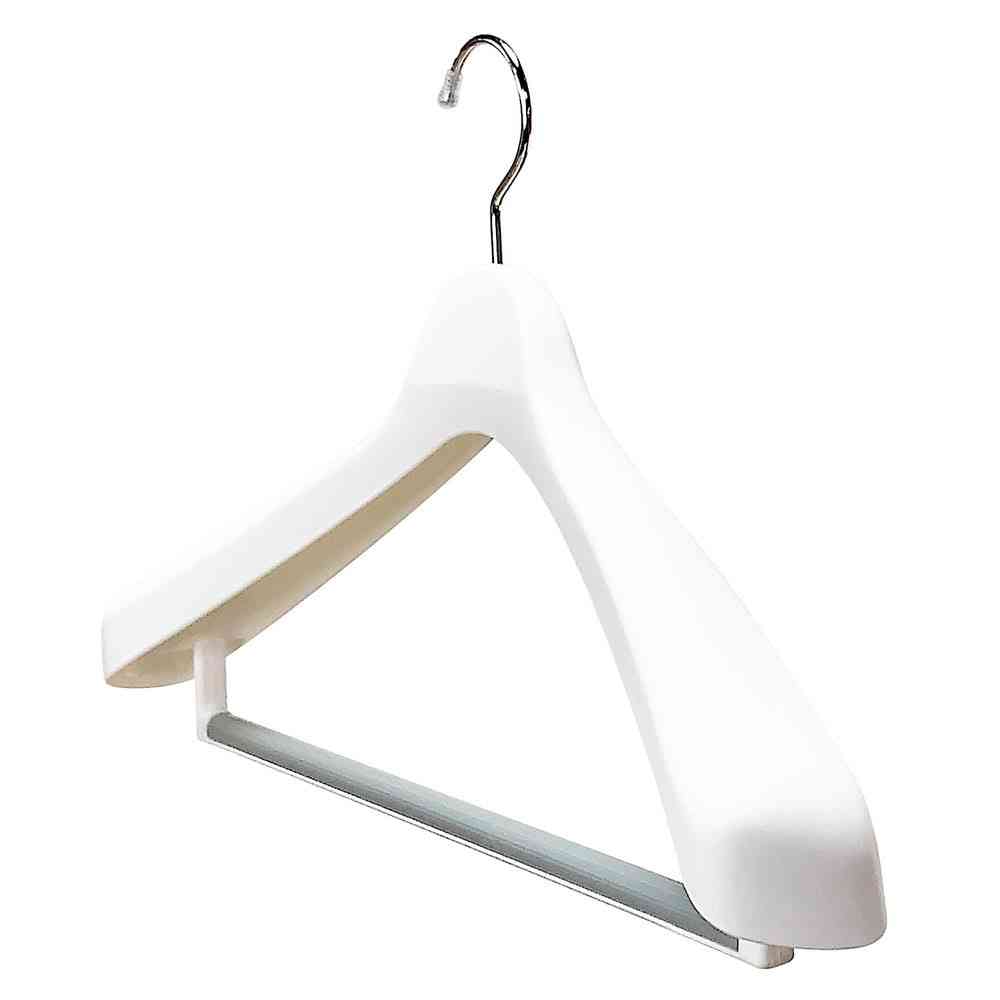 ワイド設計でジャケットの型崩れを防ぐジャケット用ハンガーです。 服の肩口に沿う丸みのある形状。 また、ワイド設計で肩先の厚みは52mm。 これにより、ジャケットやスーツの型崩れを防ぎます。 下のバー部分は、ラバー状のすべり止め付き。 軽い衣類でもしっかり掛けられます。 フックは回転し、向きを変えられます。