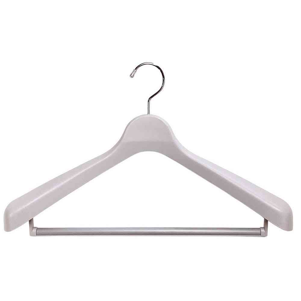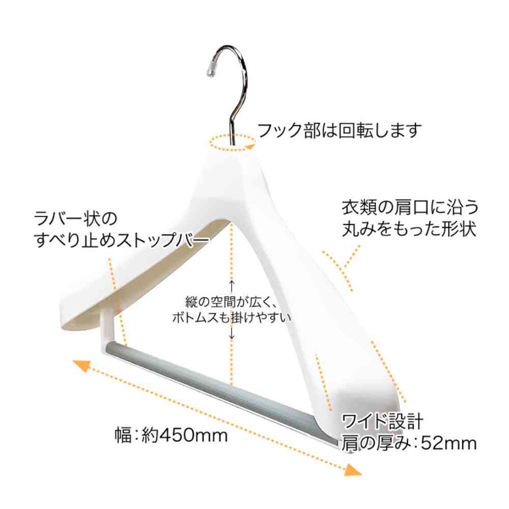 ワイド設計でジャケットの型崩れを防ぐジャケット用ハンガーです。 服の肩口に沿う丸みのある形状。 また、ワイド設計で肩先の厚みは52mm。 これにより、ジャケットやスーツの型崩れを防ぎます。 下のバー部分は、ラバー状のすべり止め付き。 軽い衣類でもしっかり掛けられます。 フックは回転し、向きを変えられます。