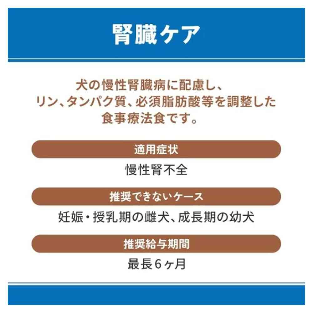 犬の慢性腎臓病に配慮し、リン、タンパク質、必須脂肪酸等などを調整した食事療法食。 【使用方法】 表示されている給餌量は使用開始時の目安です。 個体差や活動量に応じて、1日の給餌量を1~数回に分けて与えてください。 ほかのフードからの切り替えは従来のフードに2割ぐらいを置き換えて与え、徐々に増やしてください。 常に新鮮な水を飲めるようにしてください。 獣医師の指導のもとに給餌してください。