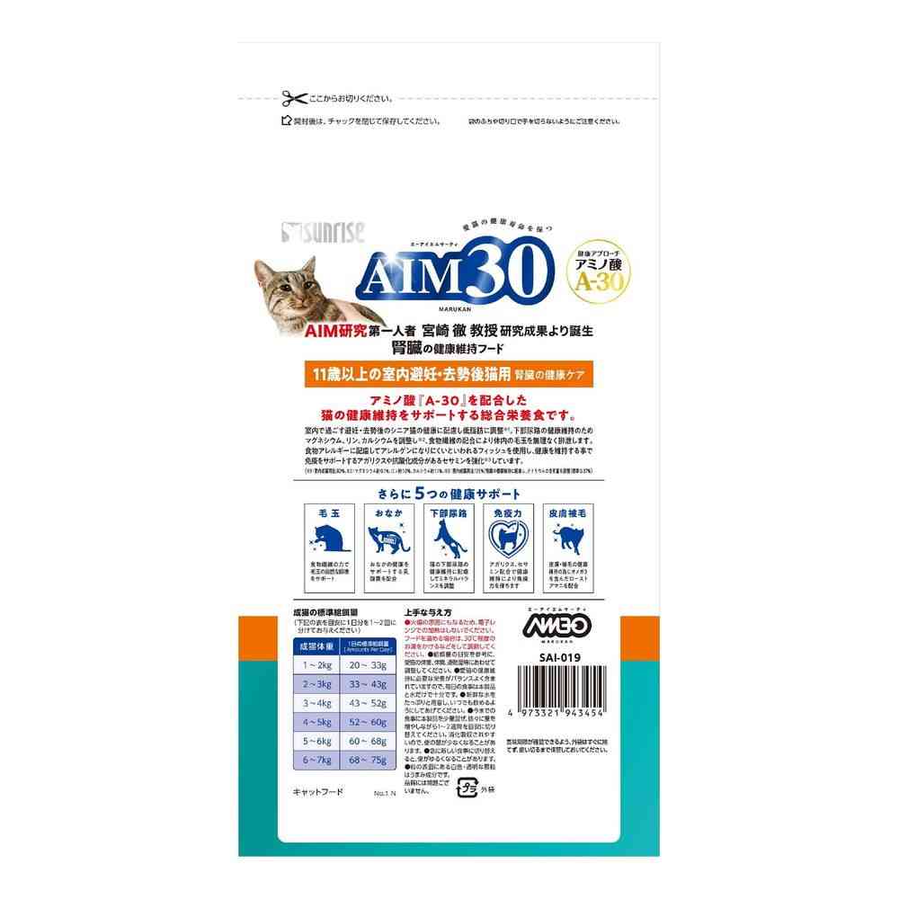 アミノ酸『A-30』を配合した猫の健康維持をサポートする総合栄養食です。 室内で過ごす避妊去勢後のシニア猫の健康に配慮し低脂肪に調整※1。 下部尿路の健康維持のためマグネシウム、リン、カルシウムを調整し※2、食物繊維の配合により体内の毛玉を無理なく排泄します。 食物アレルギーに配慮してアレルゲンになりにくいといわれるフィッシュを使用し、健康を維持する事で免疫をサポートするアガリクスや抗酸化成分があるセサミンを強化※3しています。 (※1:室内成猫用比80%、※2:マグネシウム約0.1%、リン約1.0%、カルシウム約1.1%、※3:室内成猫用比125%)腎臓の健康維持に配慮し、ナトリウムの含有量を調整(標準0.37%)