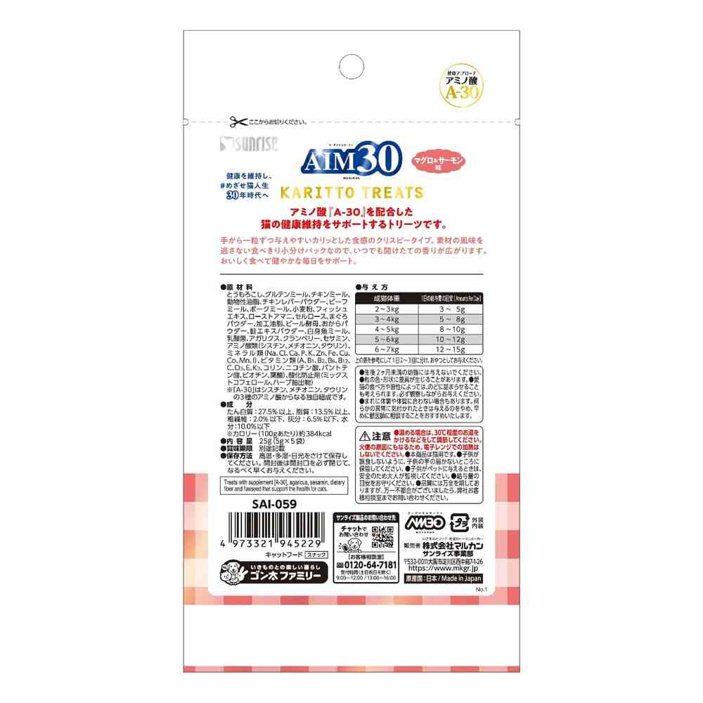 とうもろこし、グルテンミール、チキンミール、動物性油脂、チキンレバーパウダー、ビーフミール、ポークミール、小麦粉、フィッシュエキス、ローストアマニ、セルロース、まぐろパウダー、加工油脂、ビール酵母、おからパウダー、鮭エキスパウダー、白身魚ミール、乳酸菌、アガリクス、クランベリー、セサミン、アミノ酸類(シスチン、メチオニン、タウリン)、ミネラル類(Na、Cl、Ca、P、K、Zn、Fe、Cu、Co、Mn、I)、ビタミン類(A、B1、B2、B6、B12、C、D3、E、K3、コリン、ニコチン酸、パントテン酸、ビオチン、葉酸)、酸化防止剤(ミックストコフェロール、ハーブ抽出物)