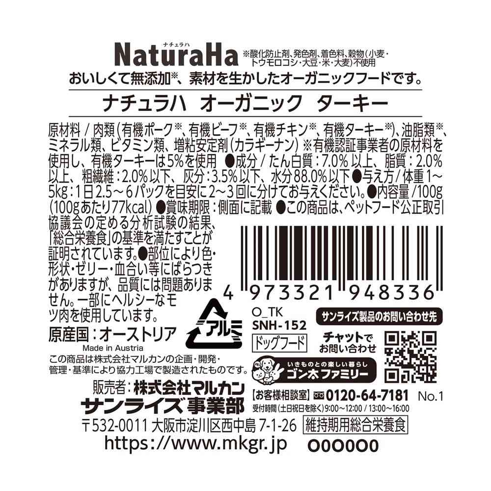 【原材料】肉類(有機ポーク※、有機ビーフ※、有機チキン※、有機ターキー※)、油脂類※、ミネラル類、ビタミン類、増粘安定剤(カラギーナン)※有機認証事業者の原材料を使用し、有機ターキーは5%を使用 【成分】たん白質:7.0%以上、脂質:2.0%以上、粗繊維:2.0%以下、灰分:3.5%以下、水分:88.0%以下